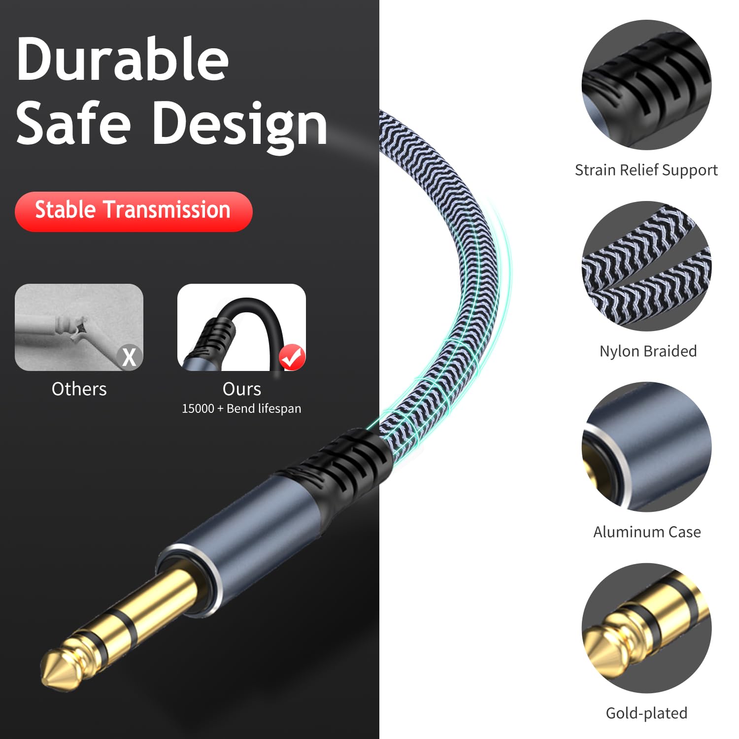 - ♫ TAiSUSAN 6.35mm extension cable uses high quality tinned copper wire and gold plated connectors, transmit high quality sound, strong and sturdy. We adopt injection Molding and shielded manufacuting process to improve its durability and stability, prevent EMI/RFI interference.
