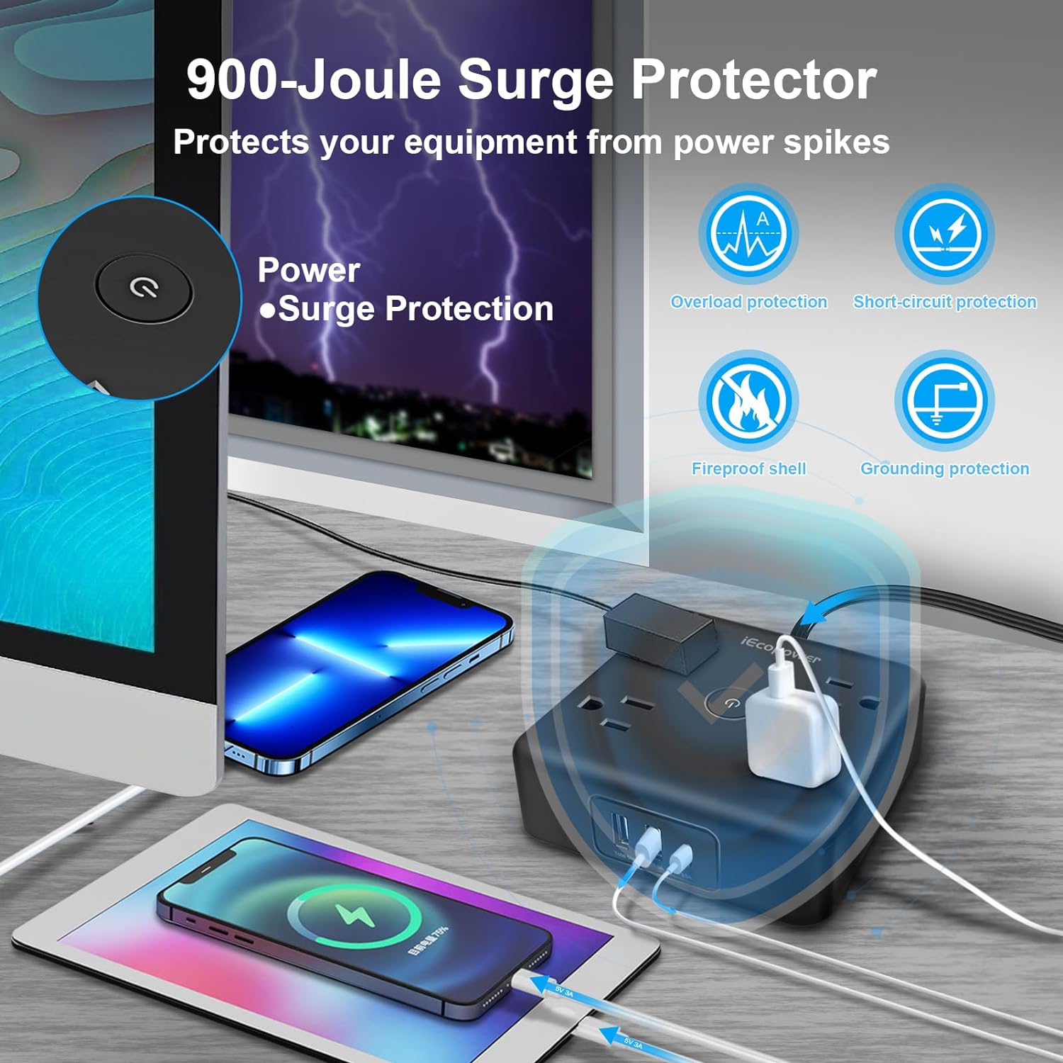 - 【Safety Surge Protector with usb ports】 -ETL safety certified, made of fireproof ABS+PC (Grade: UL-V0, the highest fire rating), can withstand high temperatures up to 1382℉, high-end solid state capacitors to ensure complete protection of your device from electrical short circuits, overheating, overcharging, overcurrent and overvoltage, so it will not heat up during use and keep your device safe.
