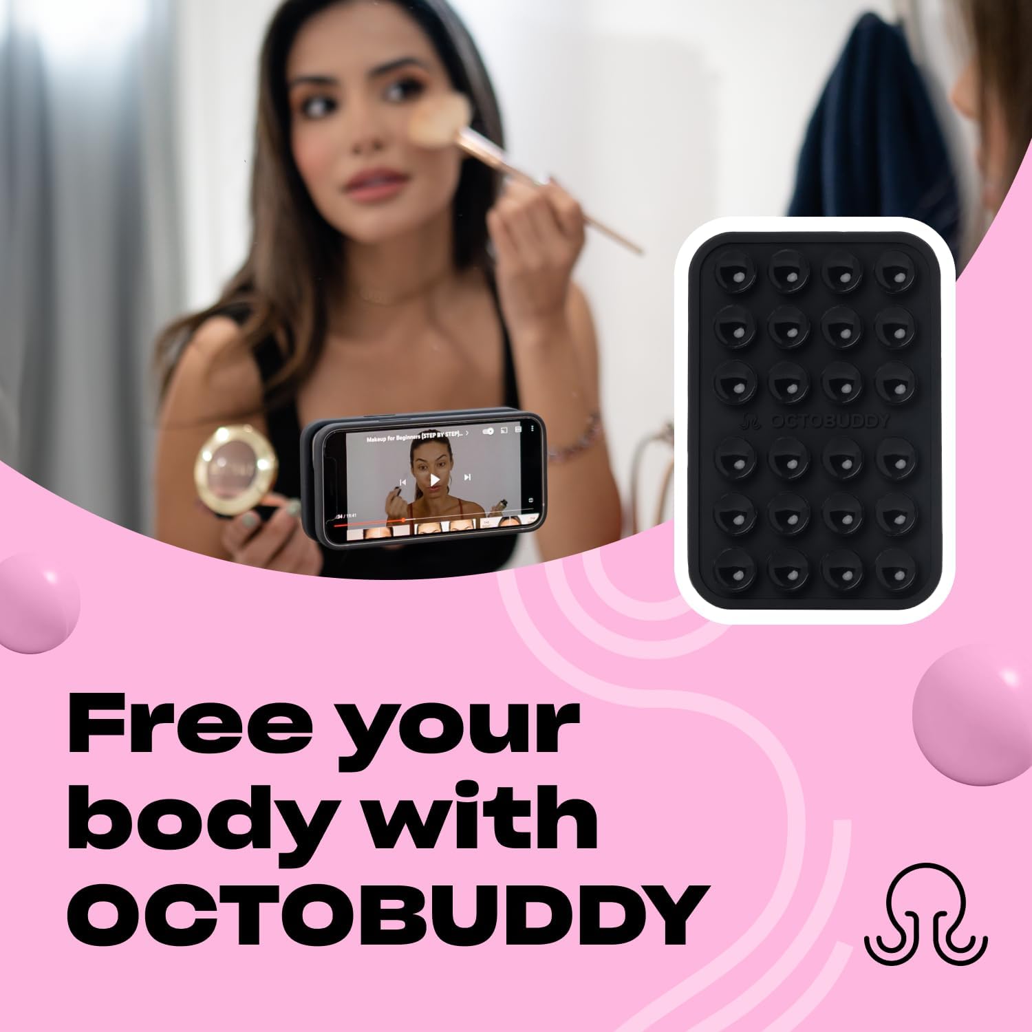 - A revolution in content creation: 24 suction cups grip mirrors, windows, and any smooth surface for steady, hands-free video and selfies with your larger smartphone