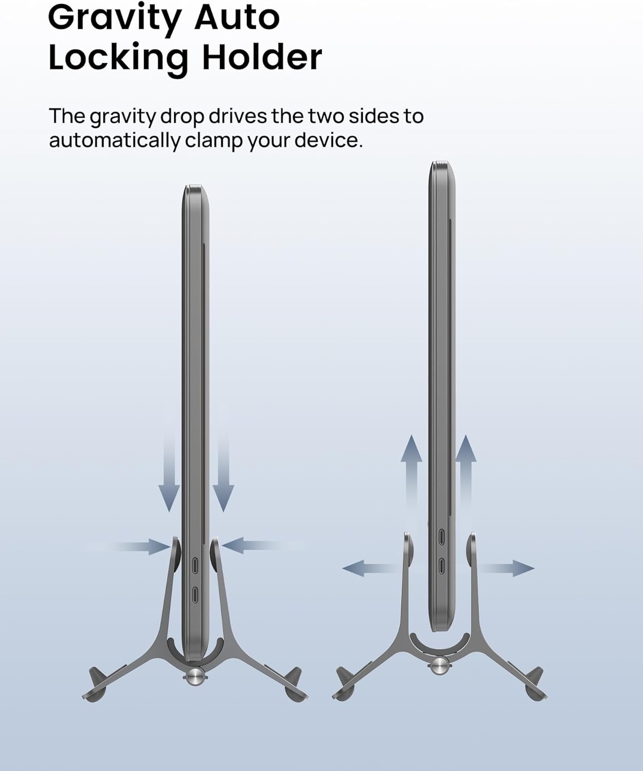 - 【Auto-lock Adjustable Width】No more fiddling with screws, Say goodbye to complicated adjustments! With auto gravity locking design, the laptop vertical stand can quickly store and retrieve your laptop, perfect for users who frequently switch between laptop and external setups.