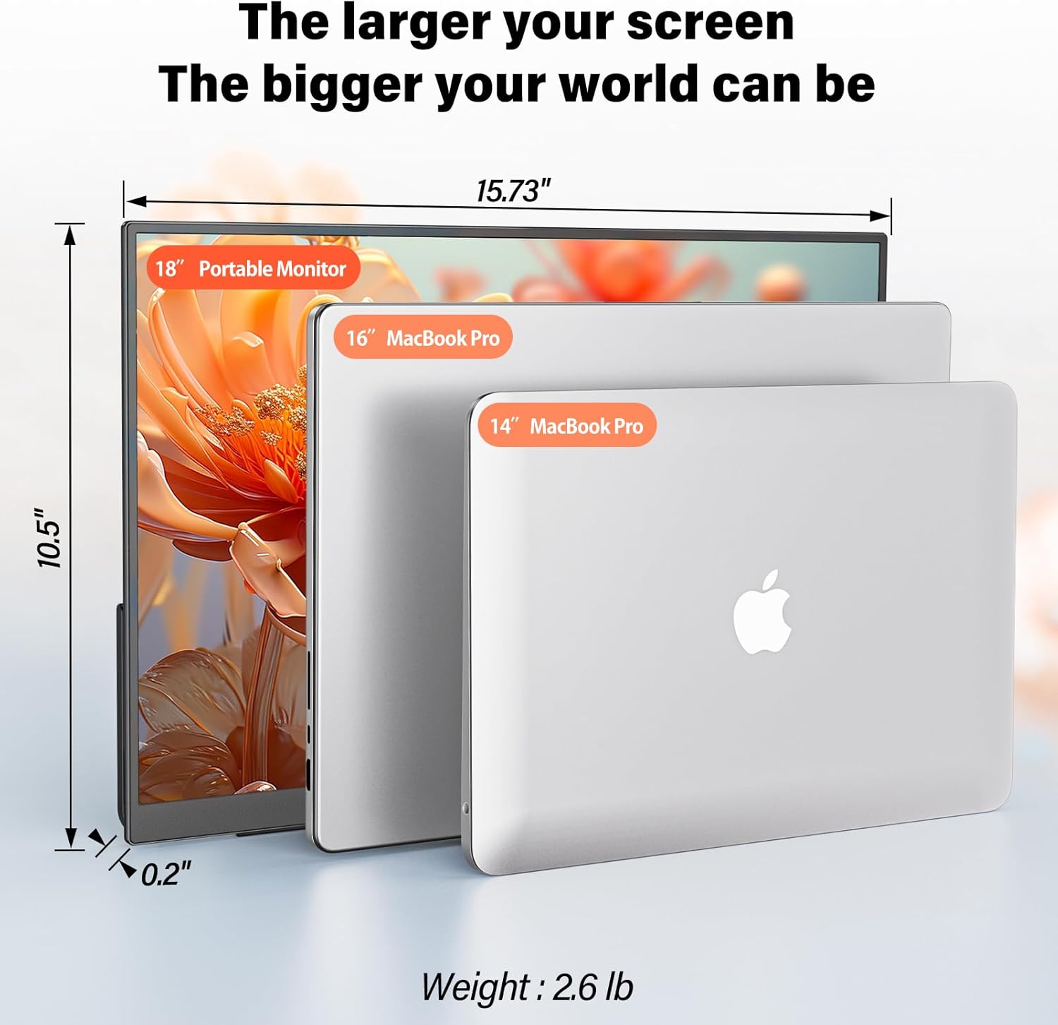 - [18" IPS Portable Laptop Monitor]: Bigger screen, but still portable. 180HZ gaming monitor provides more viewing space compared to 15.6/17.3" monitors, very suitable for multitasking, whether gaming or office work. 16:10 aspect ratio allows for more viewing area than regular 16:9, because it provides more vertical space. Size-15.72"(L)x10.5"(W), thickness-0.2", weight-2.3lb. Please be sure to CHECK the dimensions before ordering, this will avoid unnecessary returns