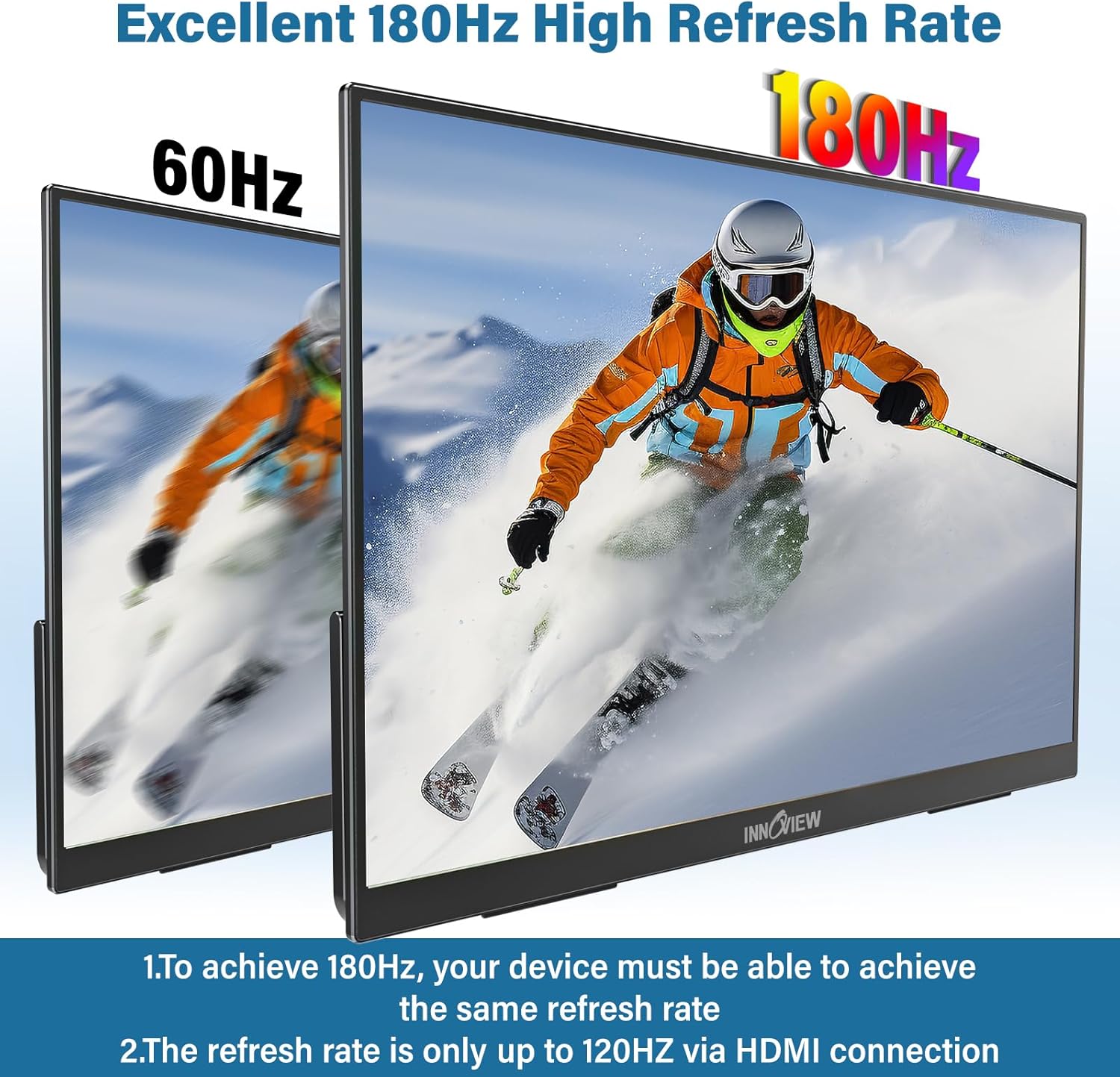 - [180HZ Monitor Born for Game Victory]: It's time to upgrade your gaming experience! InnoView 180Hz portable computer monitor, with lightning-fast ultra-high refresh rate, brings you smooth images without blurring. Equipped with Freesync technology, it eliminates tearing and stuttering. Built-in 7 front sight assistance modes help you hit the target on the battlefield and become a true shooting king. Perfect for gamers to enjoy games, also suitable for professionals to work, travel, and study