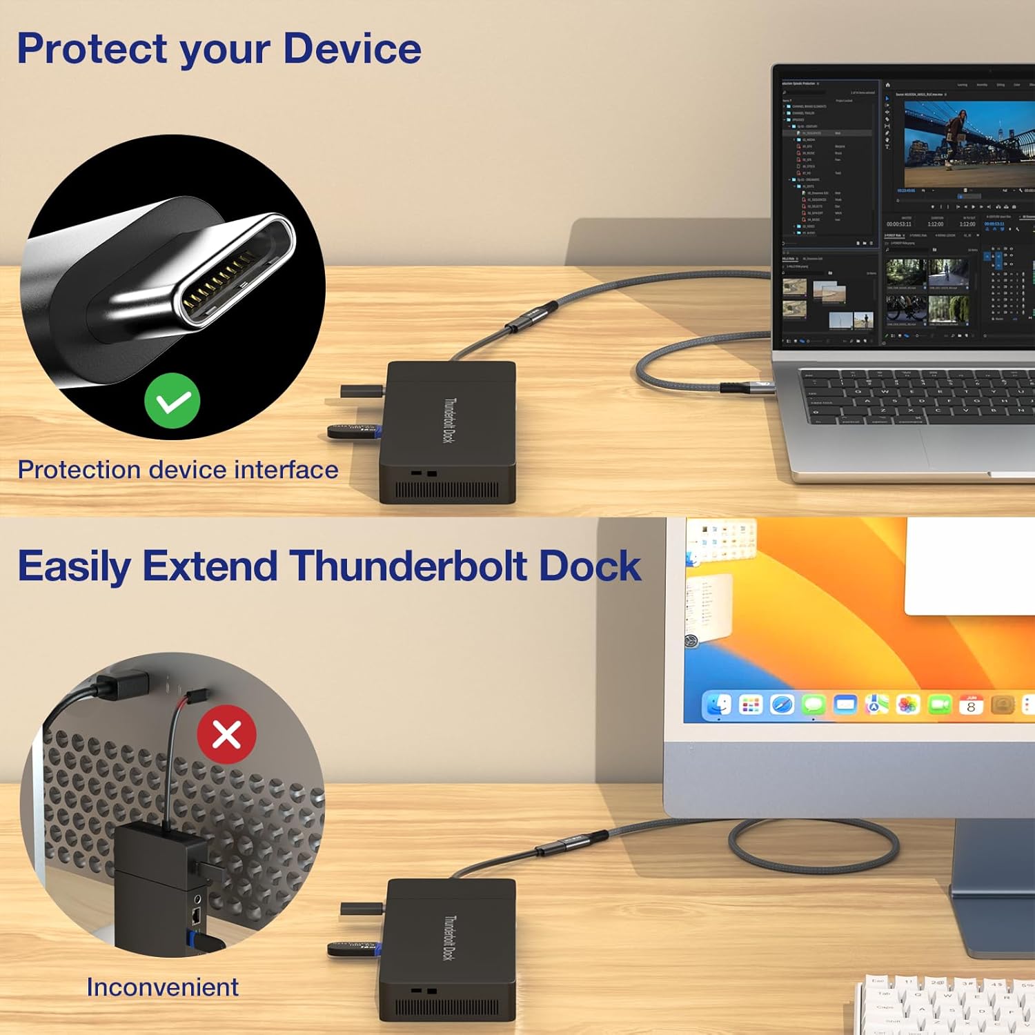 - Gold-Plated Plug & Nylon Braided: Our Thunderbolt 4 extension cable male to female cable is upgraded with gold-plated technology, which can better improve the service life of the plug and signal transmission. The cable body is made of heavy-duty nylon braided, which improves the wear resistance and flexible bending times of the USB C extension, also all of our products provide 18-month free return and exchange service.