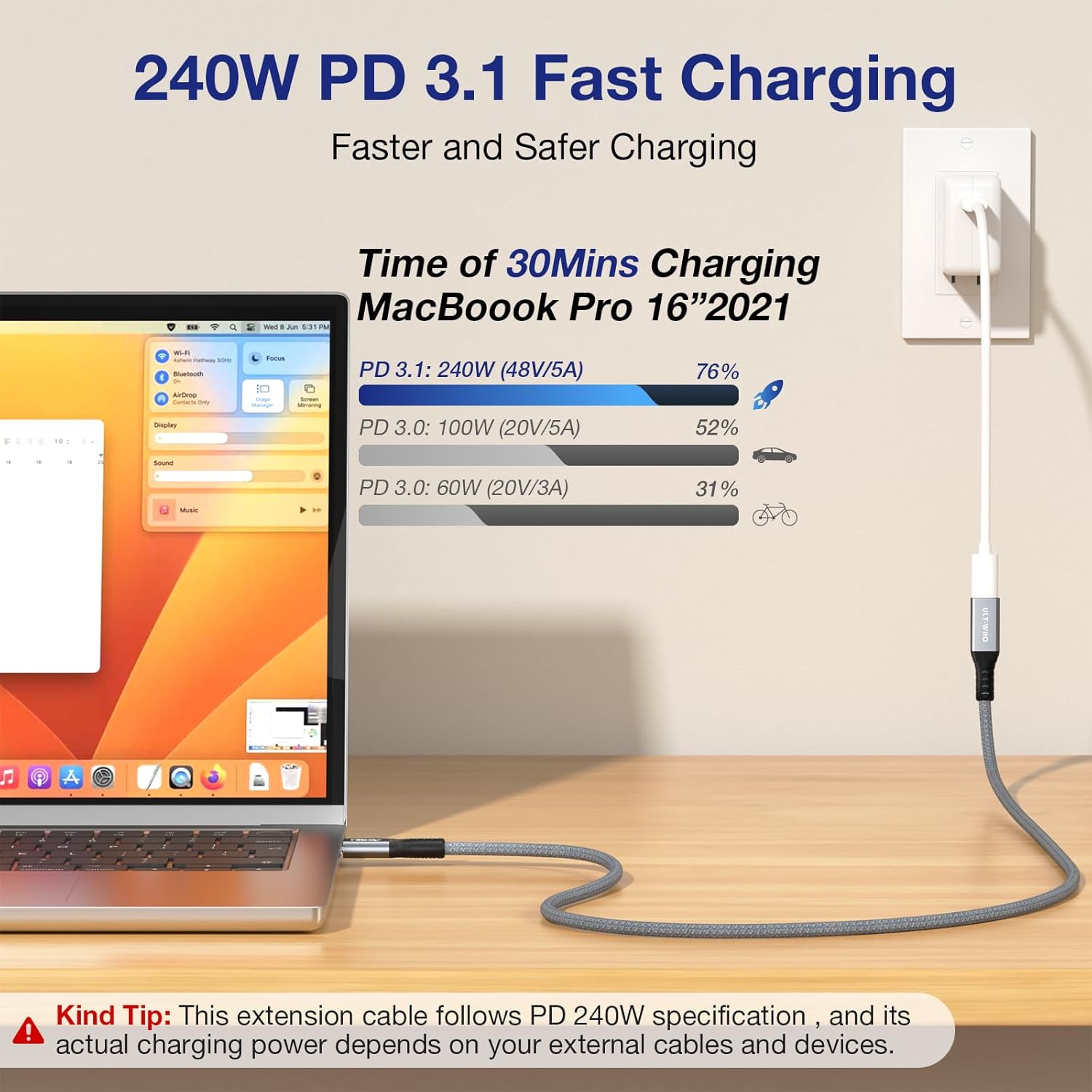 - 240W Super Fast Charging: Our usbc to usbc extension cable uses the latest Power Delivery technology to fast charge all USB-C devices, including Qualcomm QC 3.0/4.0/5.0, Samsung AFC, HuaWei SCP, USB PD 2.0/3.0 . Support a maximum power of 240W(48V 5A). our USB C male to female extension cable can bring you the ultimate fast charging experience. (NOTE:Enable PD compatibility mode when using non-PD protocol devices.)