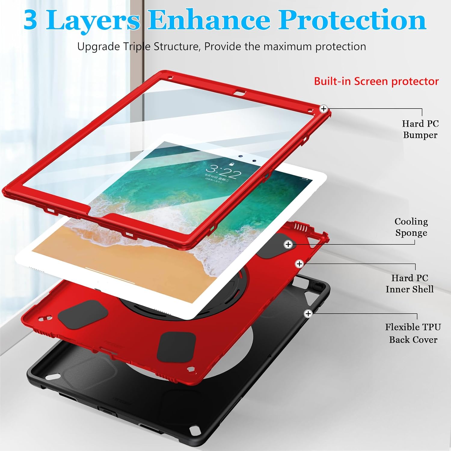 iPad Pro 12.9 Case 2nd Generation 2017 & 2015 1st Generation, Heavy Duty Rugged TPU Protective Cover with Screen Protector- Stand + Handle Hand & Shoulder Strap + Pencil Holder- Red+Black