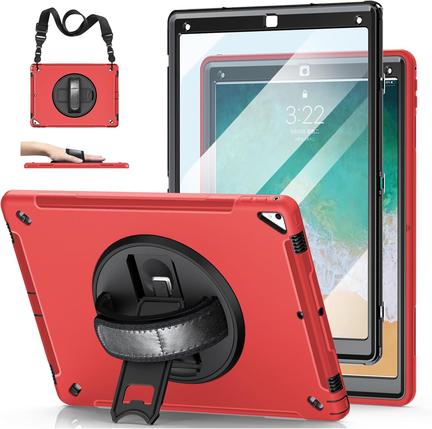 - ADJUSTABLE HAND STRAP + SHOULDER STRAP: This hand strap is convenient for you to hold when you use this ipad for show and tell. You can carry tablet with shoulder strap and even hang it on your car seat during hiking, traveling other outdoor activities