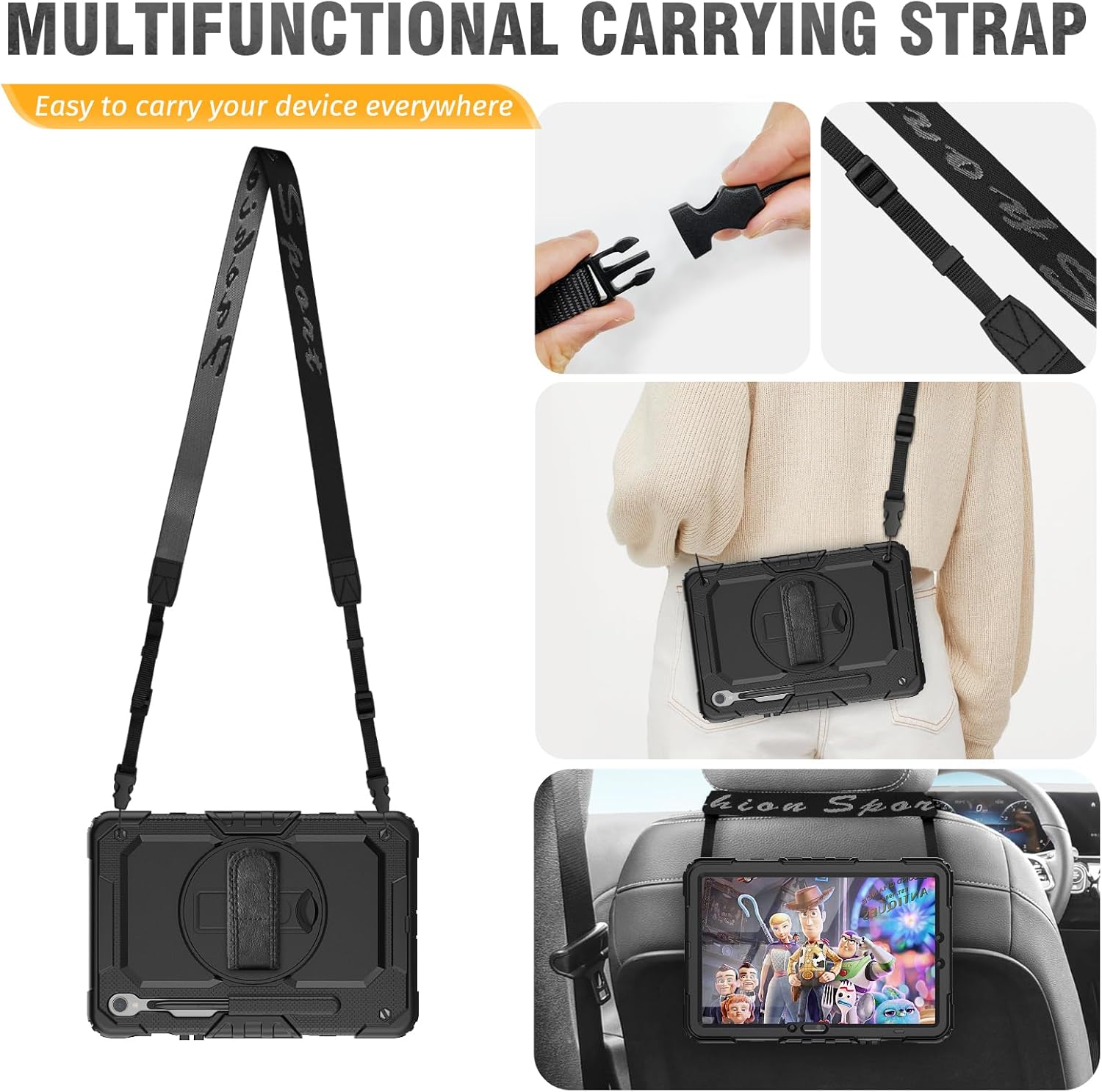 - Multifunctional Carrying Strap : Detachable and adjustable shoulder strap, both kids and adults can carry the S10 FE tablet around. Especially ideal for traveling! Because you can hanging it on the back of the seat during car rides like a TV.