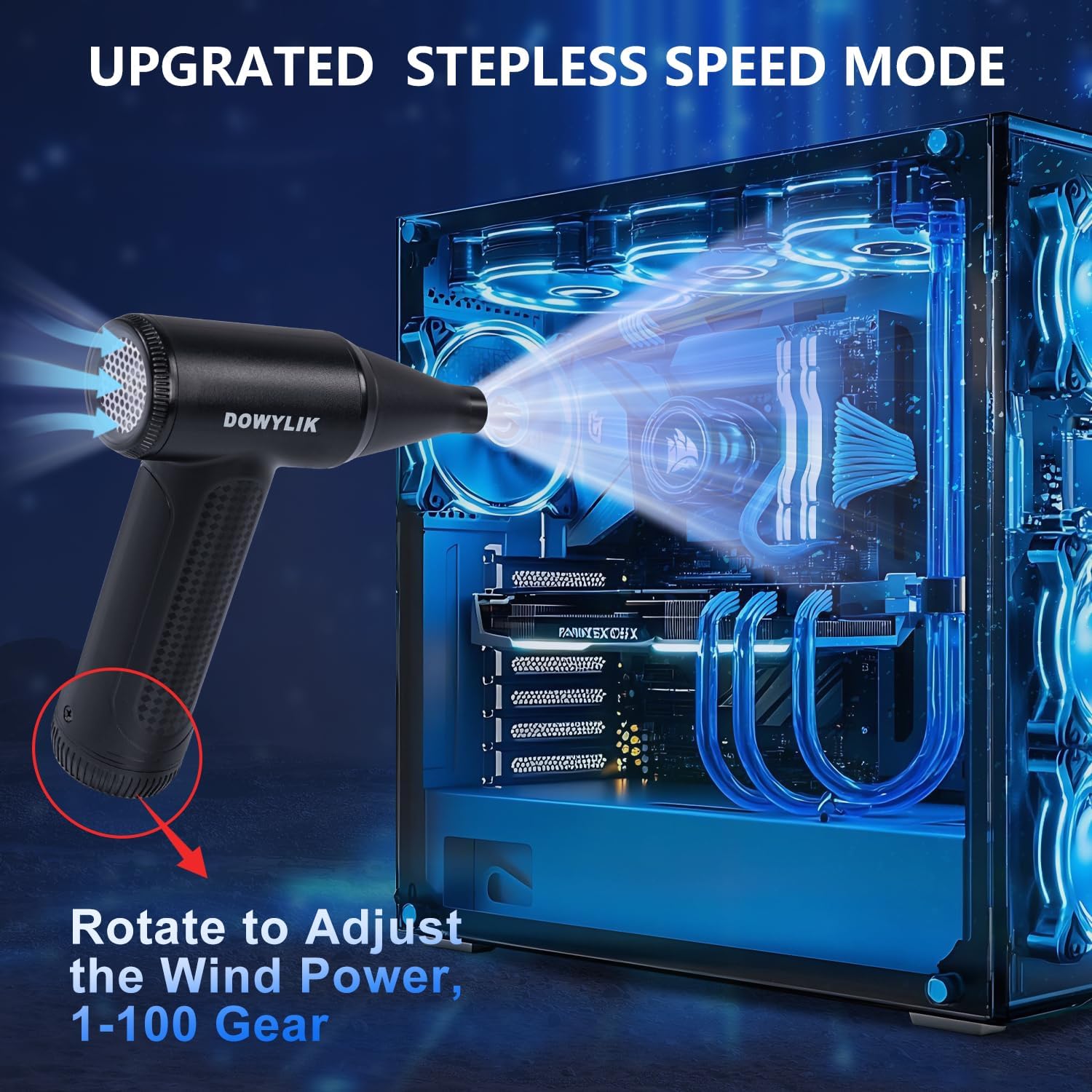 - Rotating Stepless Speed Control for Precision Cleaning:Featuring a rotating, stepless speed control, the DOWYLIK Compressed Air Duster allows you to customize airflow between 40,000 to 150,000 RPM to suit your specific cleaning needs. Whether you're cleaning delicate electronics or blasting dust out of tight spaces, the adjustable speed ensures precise and effective cleaning. Its compact, portable design (5.4 x 2.8 x 1.4 inches, 0.7 lbs) makes it easy to carry and use in any environment