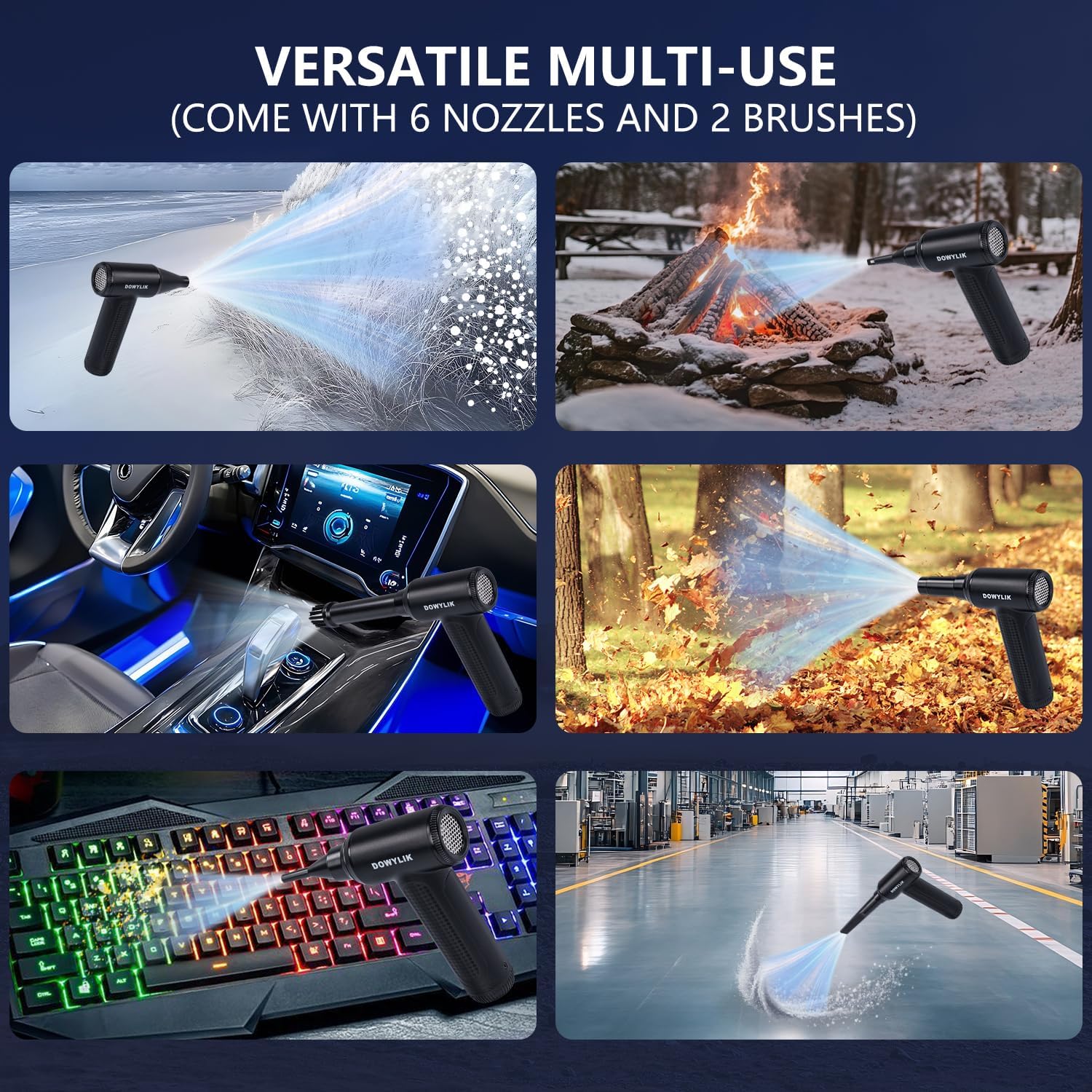 - Versatile Multi-Use PC Cleaning Kit: Equipped with 6 nozzles and 2 brushes, the DOWYLIK Mini Air Blower is a multi-purpose cleaning tool perfect for maintaining PCs, keyboards, electronics, cars, and home appliances. It also serves as a highly efficient inflator for items like swimming rings, yoga balls, and air mattresses, offering a versatile solution for all your cleaning and inflating needs at home or in the office