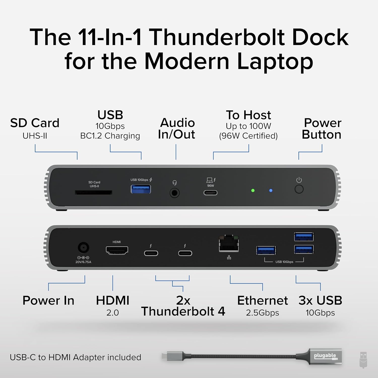 - 11 Port Expansion - HDMI docking station built for modern laptops, 3x Thunderbolt 4 ports (40Gbps) — 1x to host, 2x for your SSD, phone, or other devices, 1x HDMI, 4x USB 3.0 (10Gbps), 2.5Gbps Ethernet, SD reader, combo audio jack, 100W charging – charge a MacBook Pro 14” M1 / M2 / M3 Pro from 0-50% in 30 minutes