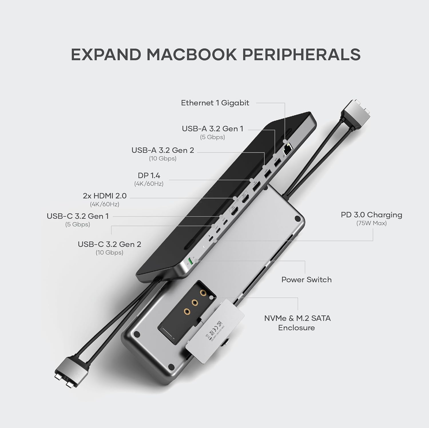 Satechi Dual USB C Docking Station and Stand with Dual 4K HDMI, Display Port, 75W USB-C PD Charging, 2 USBC Data, 2 USB-A, Ethernet, SATA and NVMe SSD Enclosure, for MacBook and Windows