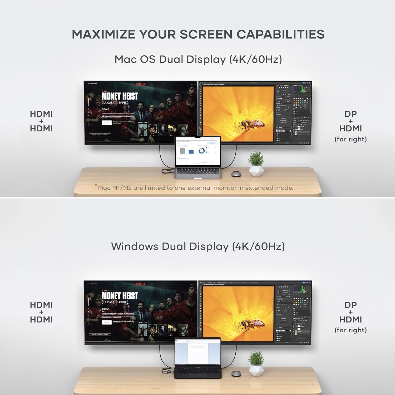 - Dual Monitor Capability - This dual docking station extends your laptop screen with up to two external monitors in extended mode. Enhance productivity with expanded visual real estate. Choose dual HDMI ports or one DisplayPort and one HDMI (use the two farthest ports). Note: The MacBook M3 Pro supports only one external monitor in extended mode.