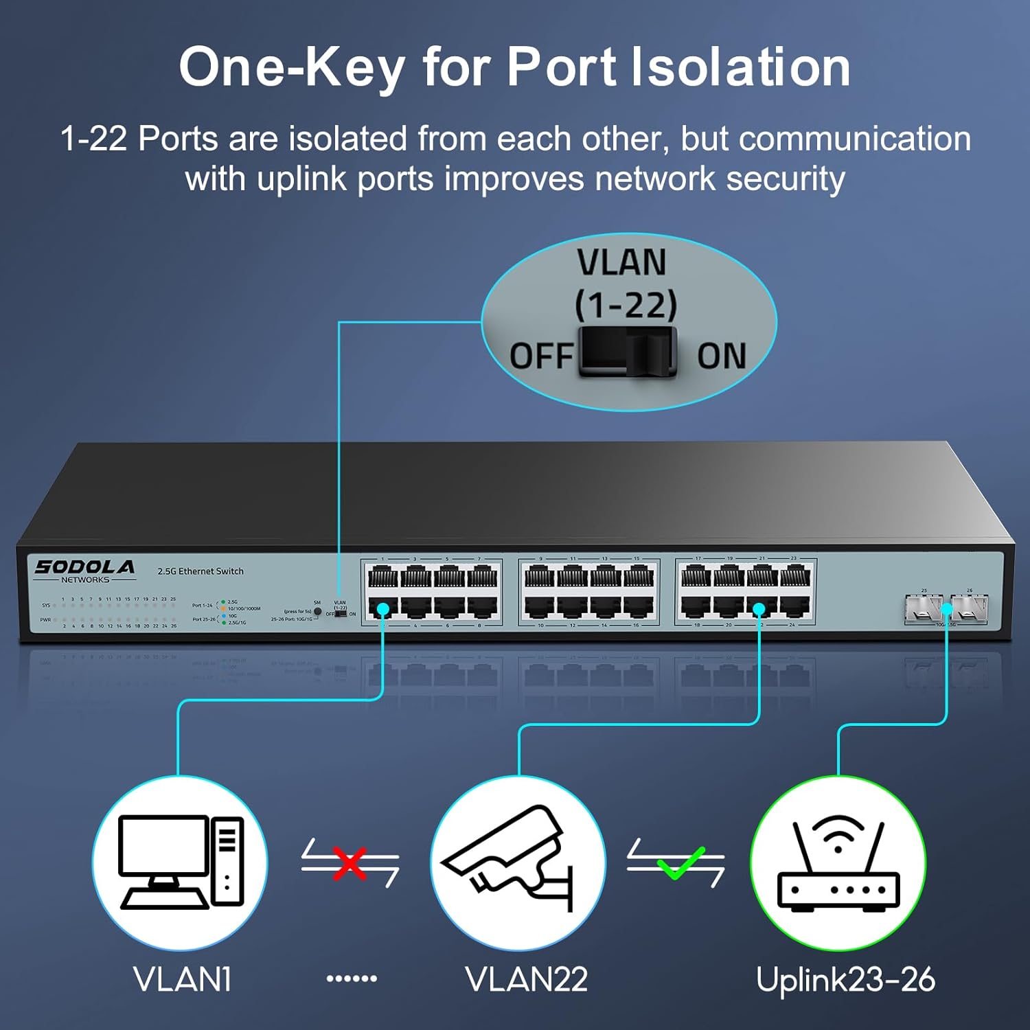 SODOLA 24 Port 2.5Gb Umanaged Switch,24X2.5G Base-T Ports,2X10G SFP, 160Gbps Switching Capacity,Port Isolation,/IU Rack-Mount/Fanless/Plug & Play Multi-Gig Unmanaged Ethernet Switch