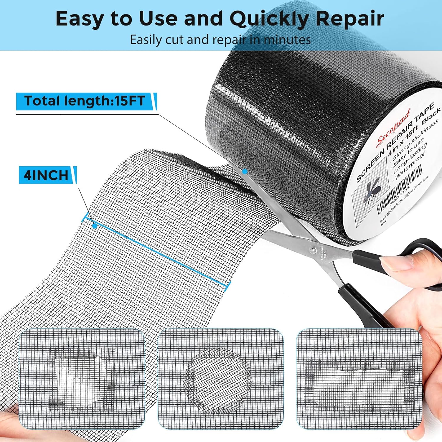 - Clippable and Save money: The size of the screen repair tape is 4 IN X 15 FT, you can cut a suitable size and shape or use more of them to repair a larger hole. No need to spend a lot to replace the entire screen mesh then