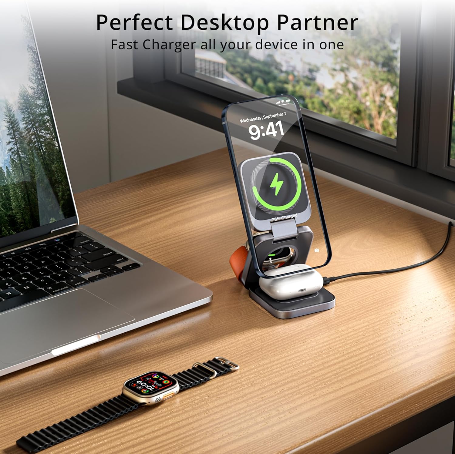 - 15W Fast Magnetic Charging Station: Experience the power of advanced wireless charging technology with our 15W fast magnetic charging station. Enjoy a quick and reliable charging experience for your Apple devices—no more worrying about slow charging speeds! Our 3-in-1 charging station allows you to charge your iPhone, AirPods, and Apple Watch simultaneously—all in one convenient location. Say goodbye to cluttered cables and messy desks, and hello to a tidy and organized charging solution;
