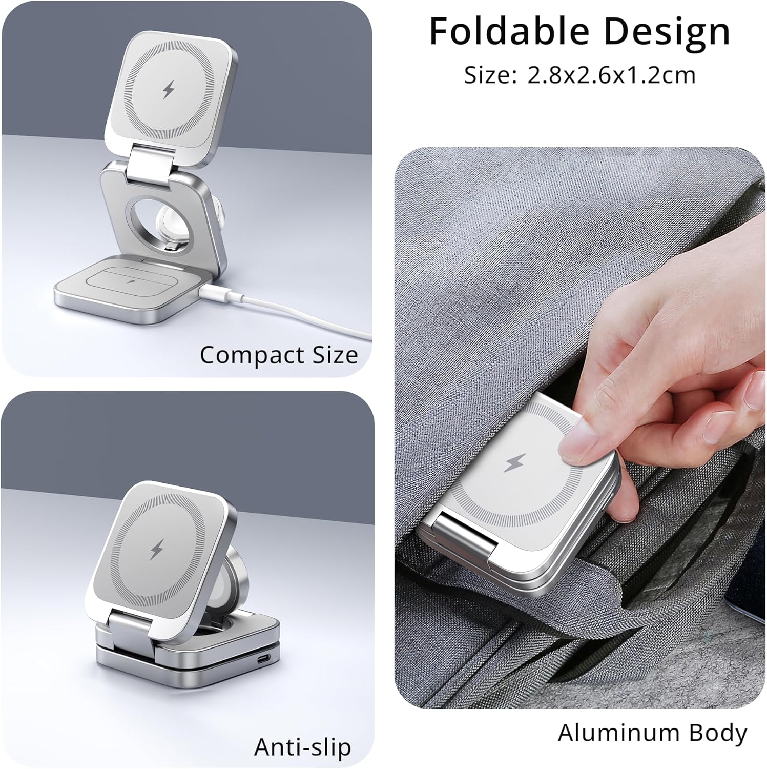 - Ultra-Compact & All-Aluminum Design: Crafted from durable aluminum alloy, this sleek charger not only exudes a powerful aesthetic but also ensures exceptional heat dissipation, alongside resistance to dirt and scratches. Its solid build provides stability for your phone during charging. Measuring just 1.1 x 1.02 x 0.47 inches (2.8 x 2.6 x 1.2 cm) when folded, this travel charger is lightweight and easy to carry. With 360-degree adjustability and the ability to fold a full 270 degrees for vertical charging, it's perfect for use at home, in the office, or on the go. A true travel essential;