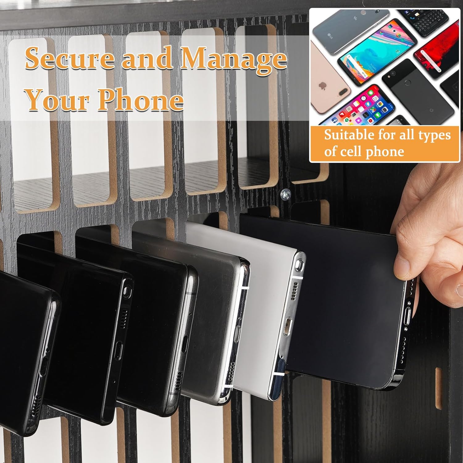 - High Quality Material: The classroom phone holder is made of high quality wood, stable and enduring, strong and practical. It can hold up to 36 cell phones to meet your needs.There are altogether two keys to the safe. Take care of your keys, don't get them to lost.