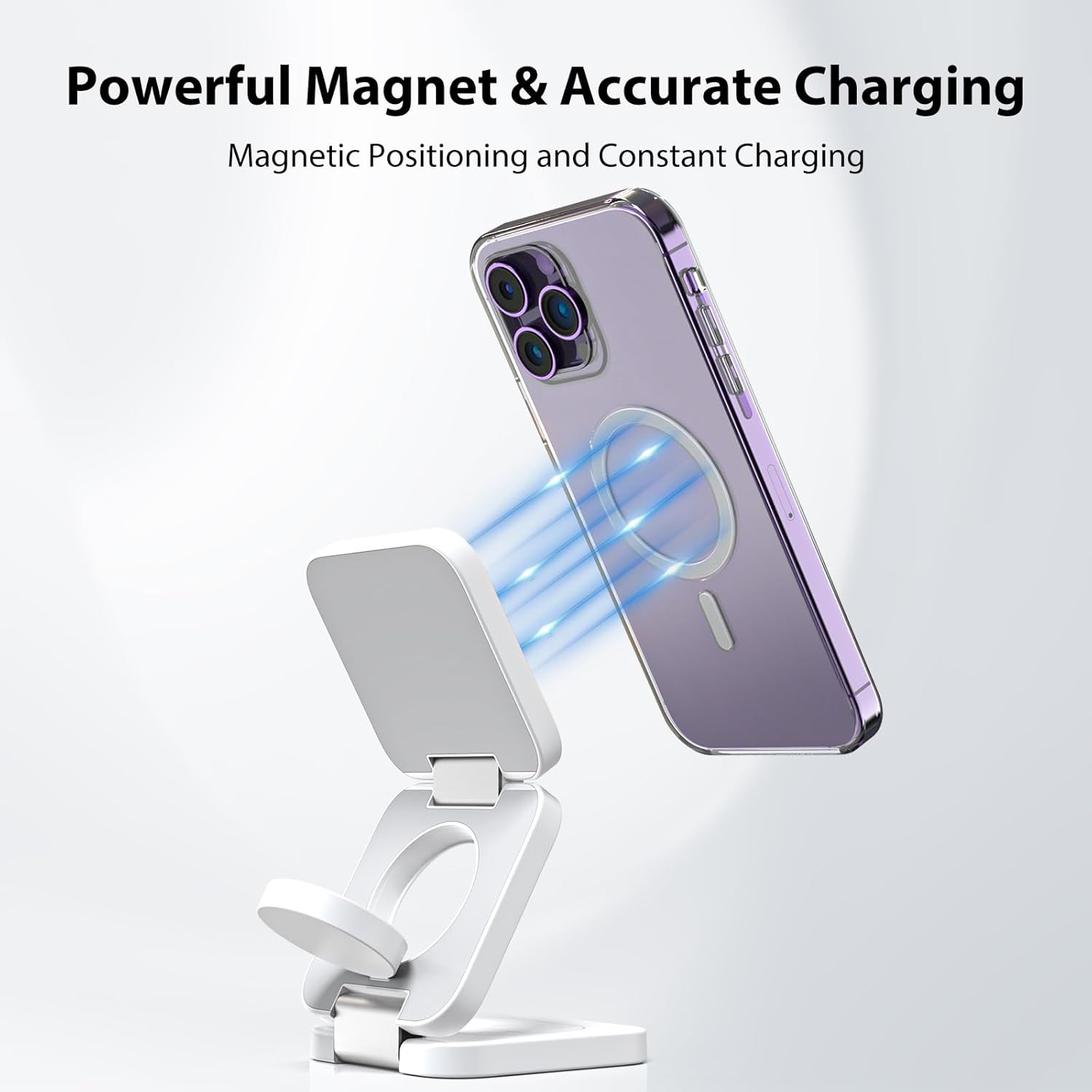 Fast Wireless Charger, Magnetic Foldable 3 in 1 Charging Station for iPhone 16/15/14/13/12/Pro/Plus/Pro Max, 5W Portable Charger for Apple Watch9/8/7/6/5/4/3/SE, for Airpods3/2/Pro-White