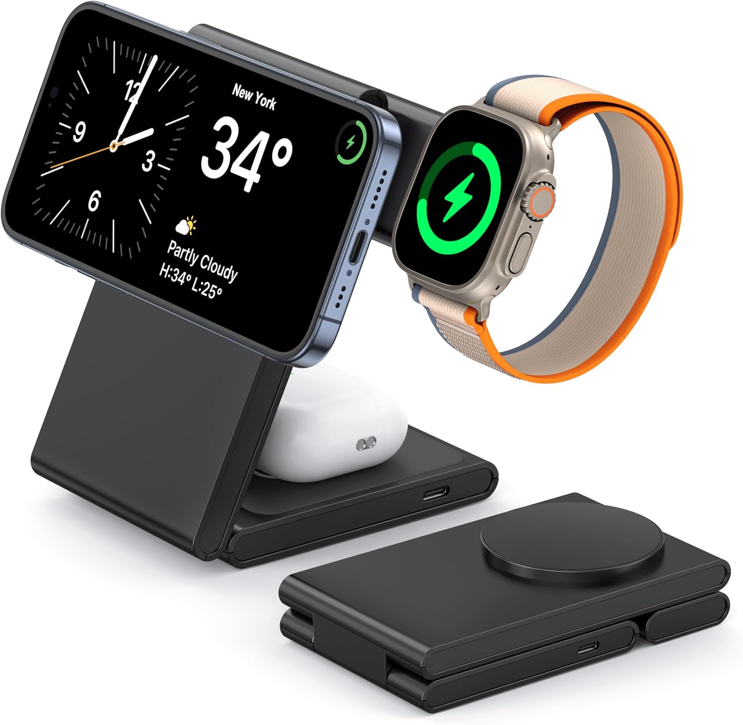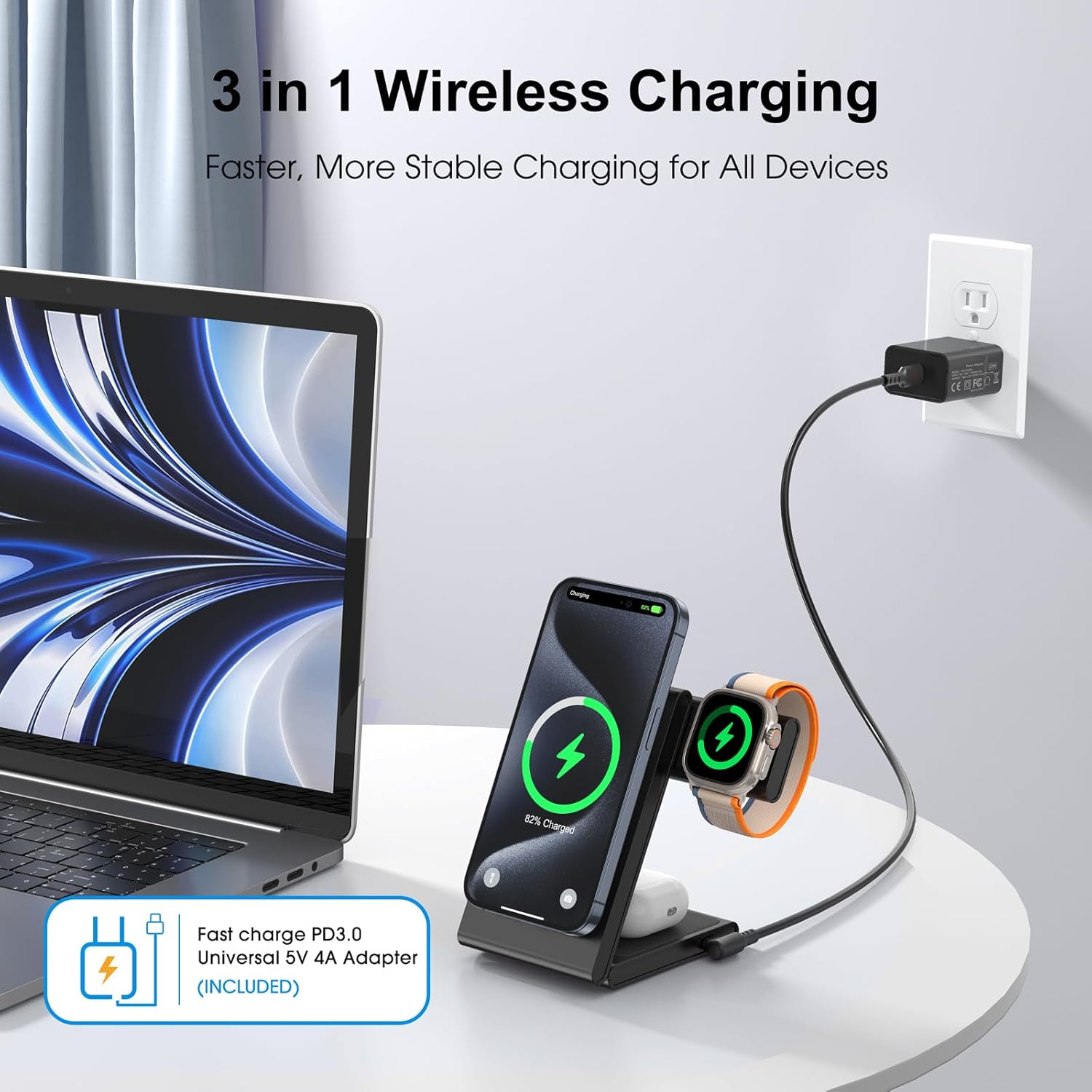 - 3-in-1 Charging Station: It’s an all-in-one wireless charging station for multiple devices. Now it's just need one wireless charger for iPhone 16/15/14/13/12 Mini/Plus/Pro/Pro Max Series. It can act as a wireless charger for AirPods Pro 3 and AirPods 4 (with wireless charging case) and a magnetic wireless charger for Apple Watch 10/9/8/7/6/5/4/3/2/SE/Ultra