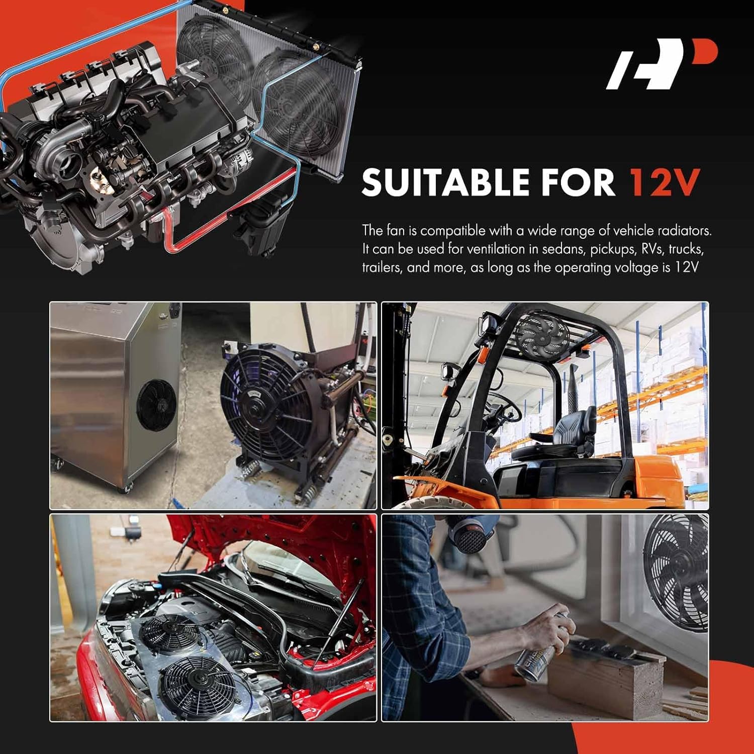 - [Wide Use]: A-Premium's Universal cooling fan is compatible with diverse vehicle radiators and featured with excellent cooling effect. It depends on the size of your radiator. The fan plays a crucial role in the working process of the engine, which is used to cool the engine and the surrounding auxiliary equipment. It is also a multi-use product which is available for the ventilation of various vehicles, such as sedan, pickup, RV, truck, trailer, etc., as long as the working voltage is 12V.