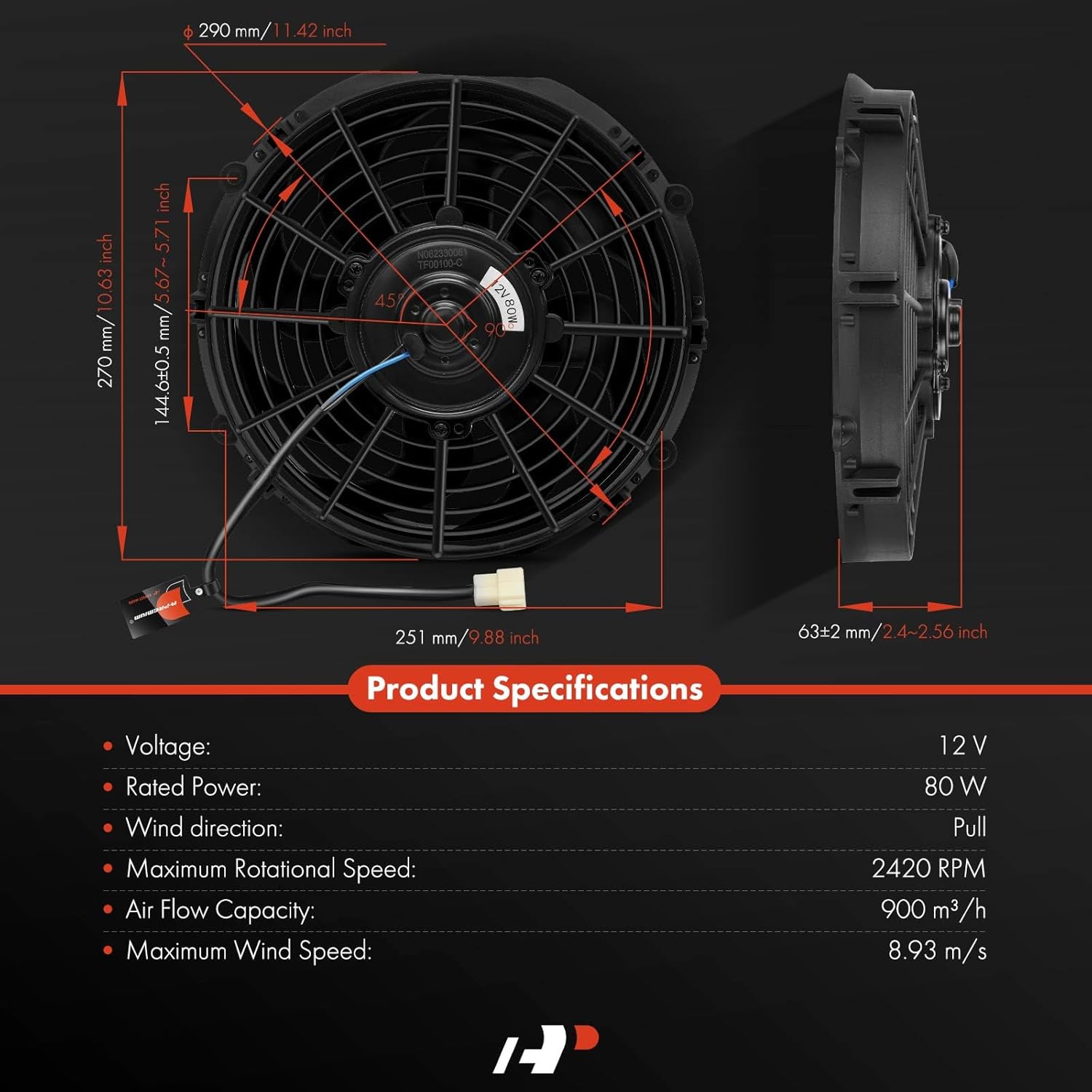 - [Important Information]: ①Kit Parts Included: 1x Radiator fan + Fan mount Kits; ②Quantity of Blades: 8; ③Fan Diameter (inch): 10; ④Voltage: 12V; ⑤Blade Shape: Curved Blade; ⑥Rated Power: 80 Watts; ⑦Wind Direction: Pull; ⑧Maximum Rotational Speed: 2420 RPM; ⑨Air Flow Capacity: 900 m³/h; ⑩Maximum Wind Speed: 8.93 m/s---Please select the number of fans according to your heat dissipation requirements for purchase. Not a direct OE replacement, modification (cut) might be required for some vehicles.