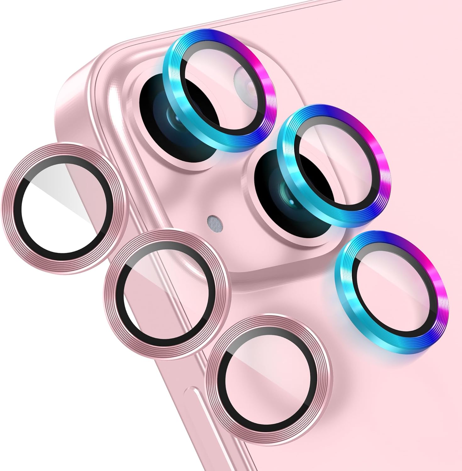 AGVEE 3+3 6 Pack for iPhone 15 6.1" / 15 Plus 6.7" Camera Lens Cover Protector, Metal Ring 9H Tempered HD Glass Camera Cover Protector Film, Pink