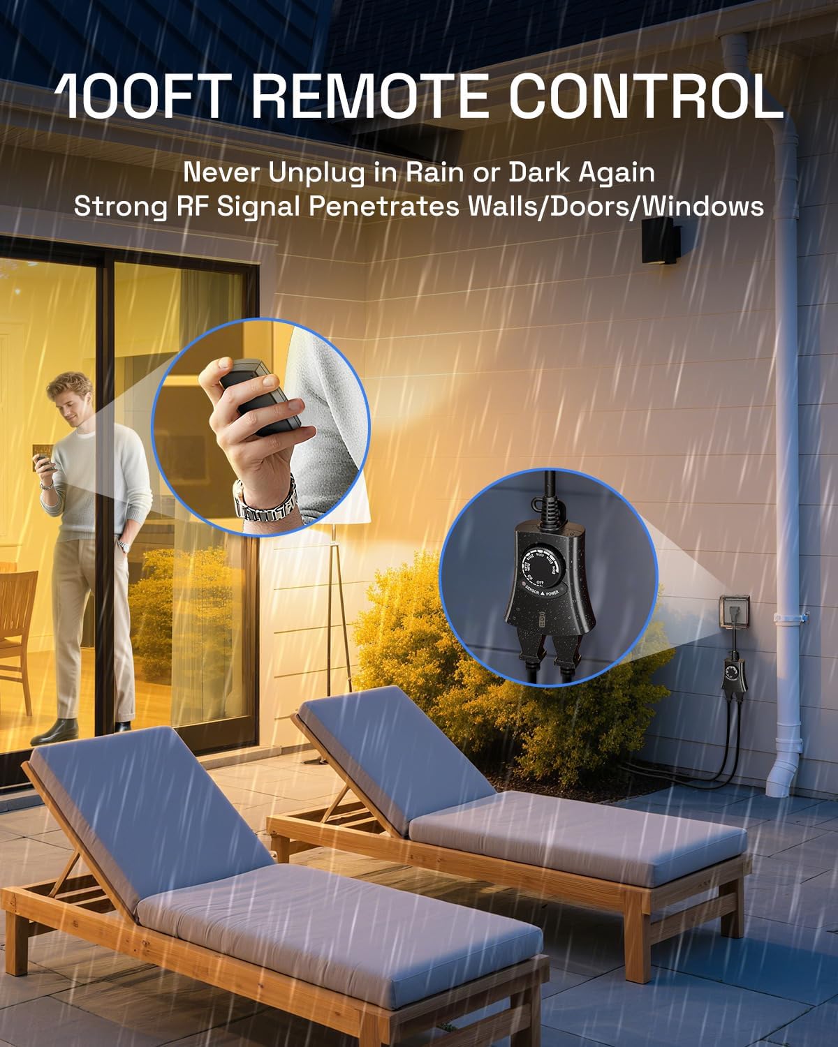 - ✅【Remote Control】This weatherproof outdoor timer includes a 6-inch cord and 2 grounded outlets. The remote control features a strong RF signal that can penetrate walls and doors, with a range of up to 100 feet in direct line of sight.