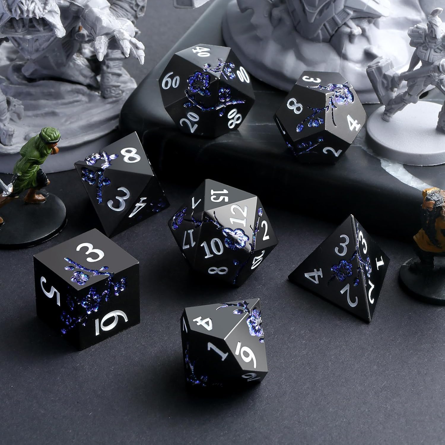 Glitter Blue D&D Metal Dice, DNDND 7 PCS Flower Metallic DND Dice Set with Gorgeous Gift Case for Dungeons and Dragon Tabletop Game (Matte Black with Glitter Blue Flower)