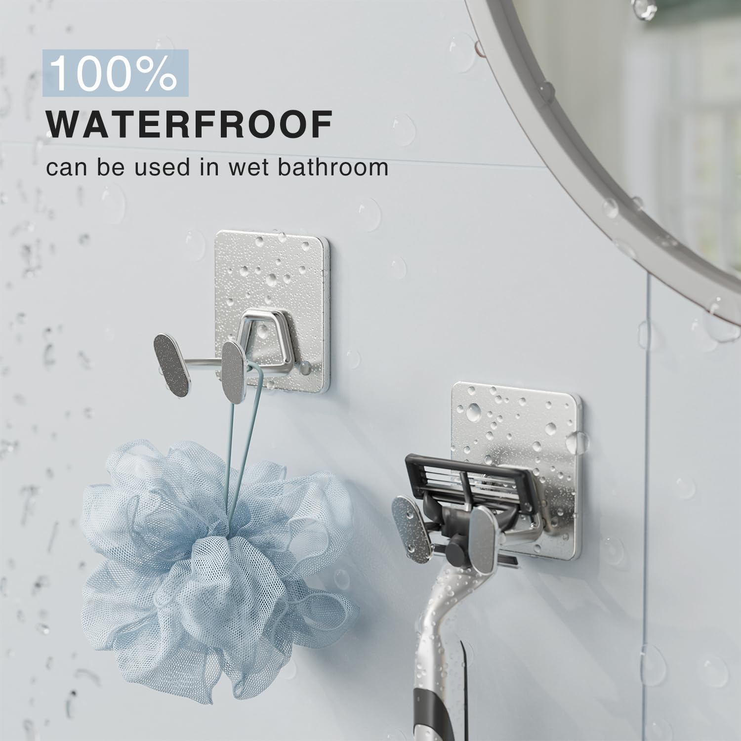Adhesive Shower Hooks for Inside - Extra Sticky Stainless, Razor Holder Shower Accessories, Wall Mounted Self-Adhesive Double Hooks for Razor, Loofah, Towel, Shaver, Coat, Key, Silver, 4-Pack