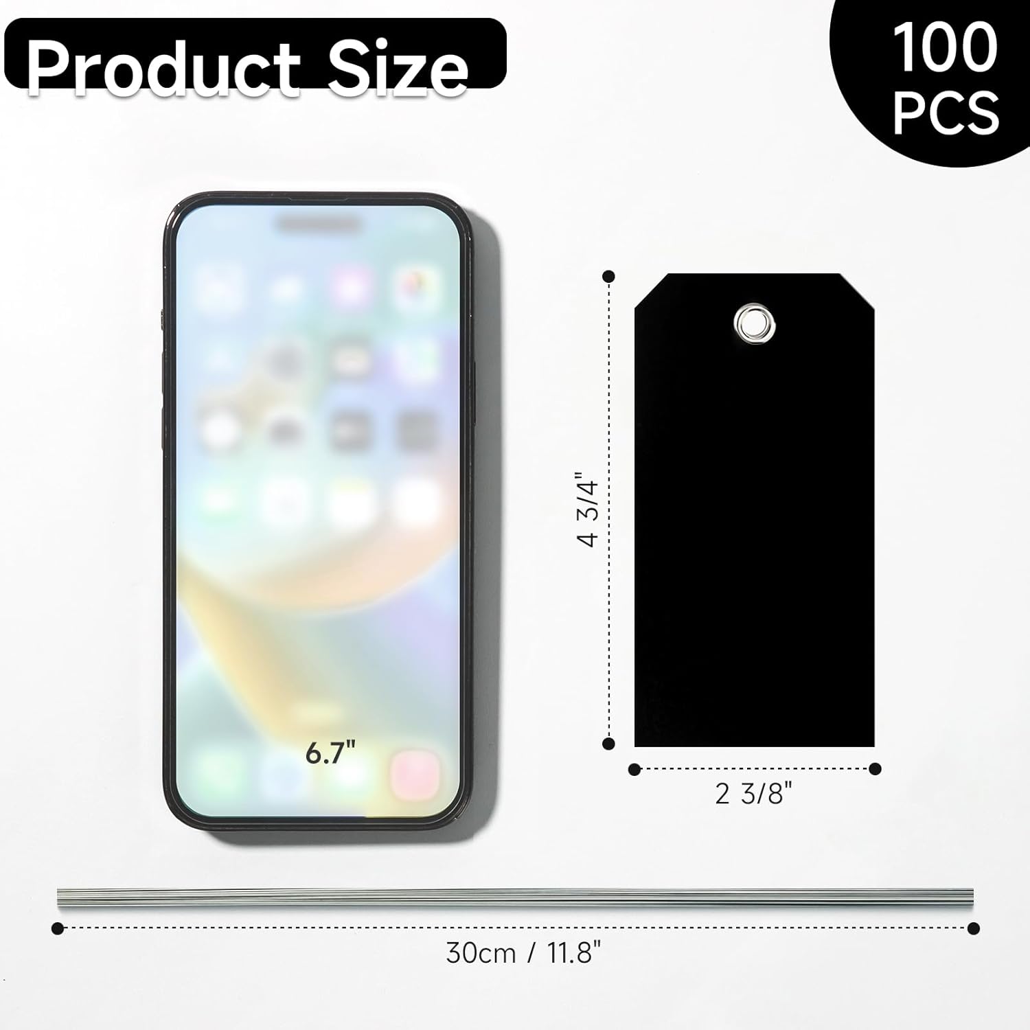 100 Pcs Waterproof Hanging Price Tags with String Attached - Black, 4 3/4" x 2 3/8" for Retail, Engraving, Gift, Equipment, Garage, Shelf Parts