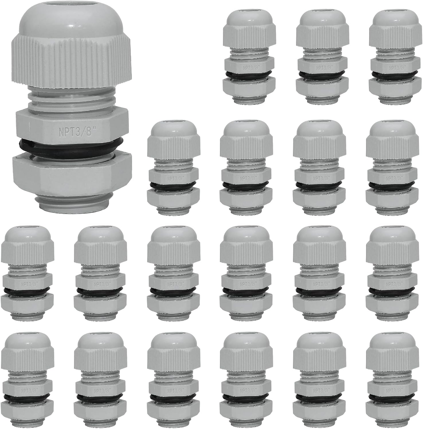 20 Pcs 3/8" NPT Nylon Cable Glands, IP68 Waterproof Adjustable Cord Grip Cable Connector Strain Relief Wire Protectors for 5-9mm Cable Diameter, Grey