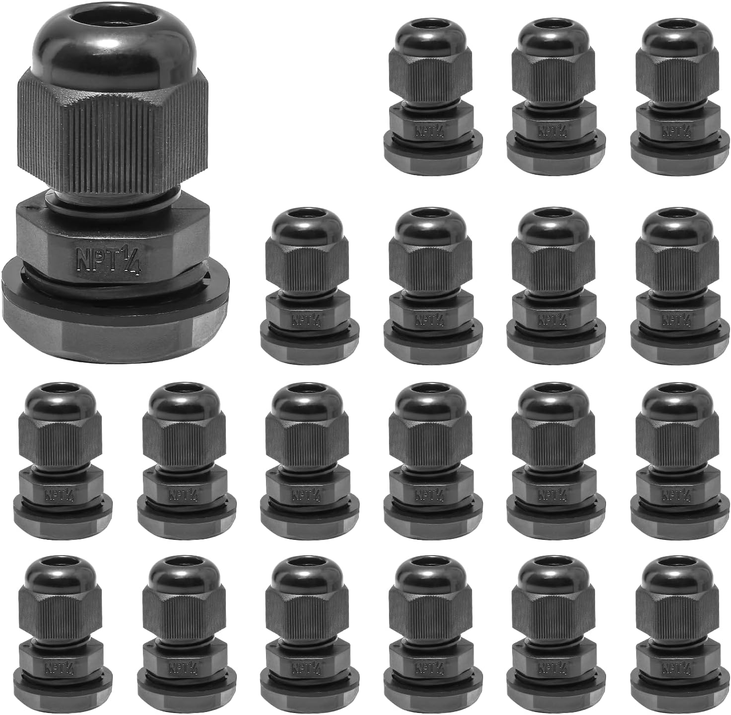 20 Pcs 1/4" NPT Nylon Cable Glands, IP68 Waterproof Adjustable Cord Grip Cable Connector Strain Relief Wire Protectors for 4-6mm Cable Diameter, Black