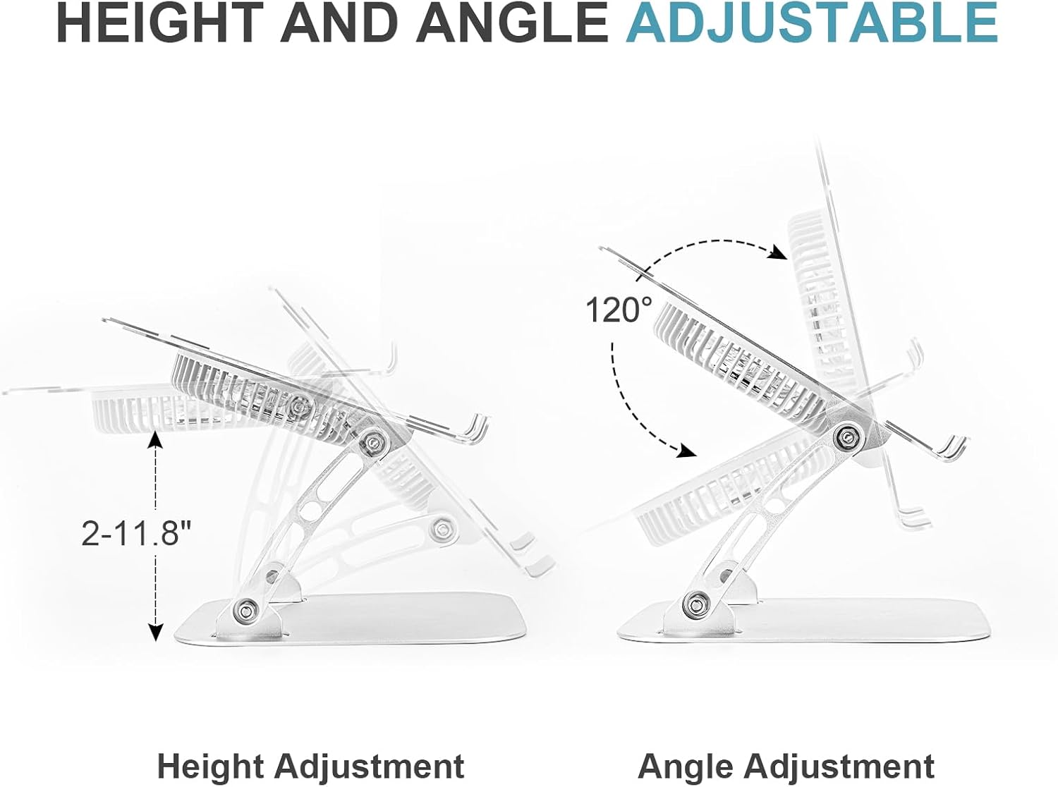 - [Height and Angle Adjustable]- Working in your most comfortable position can boost your productivity and creativity. This laptop stand allows you to adjust freely the height to 11.8 inches adjust angle from 0 to 120 degrees, so you can comfortably work in sitting positions.