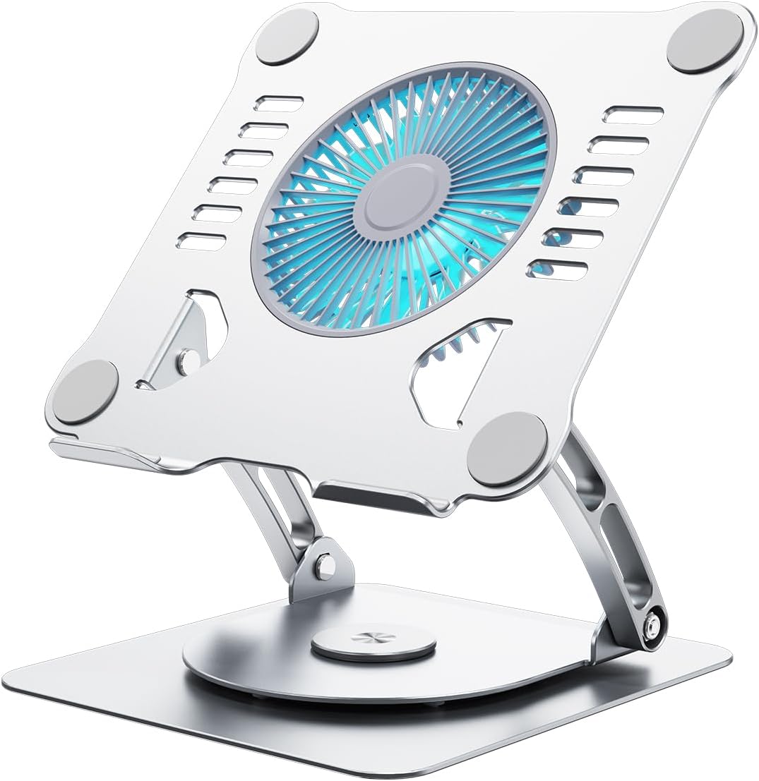SHUWEI 360° Rotating Laptop Cooling Stand with 3 Speed Fan, Adjustable Height Laptop Stand for Desk, Ergonimic Aluminum Laptop Cooling Pad for 10-15'' Notebook - Silver