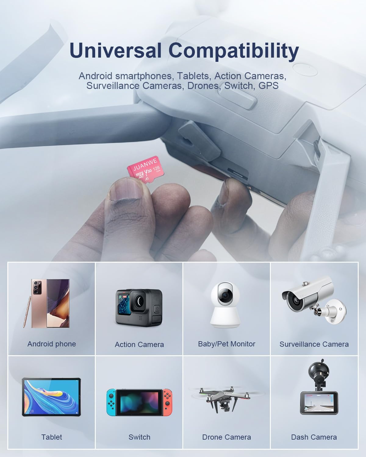 - Wide Compatibility: The 128gb memory card has wide compatibility and can be used with a variety of digital devices; Compatible with action cameras, drones, DSLR cameras, smartphones, driving recorders and more
