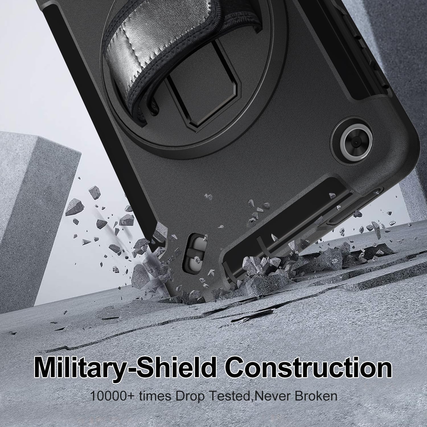 Junfire Shockproof Case for Lenovo Tab M8 4th Gen 2023, Heavy Duty Rugged Case with 360°Rotatable Kickstand/Hand Strap/Stylus Holder for TB-300FU/TB-300FX, Black