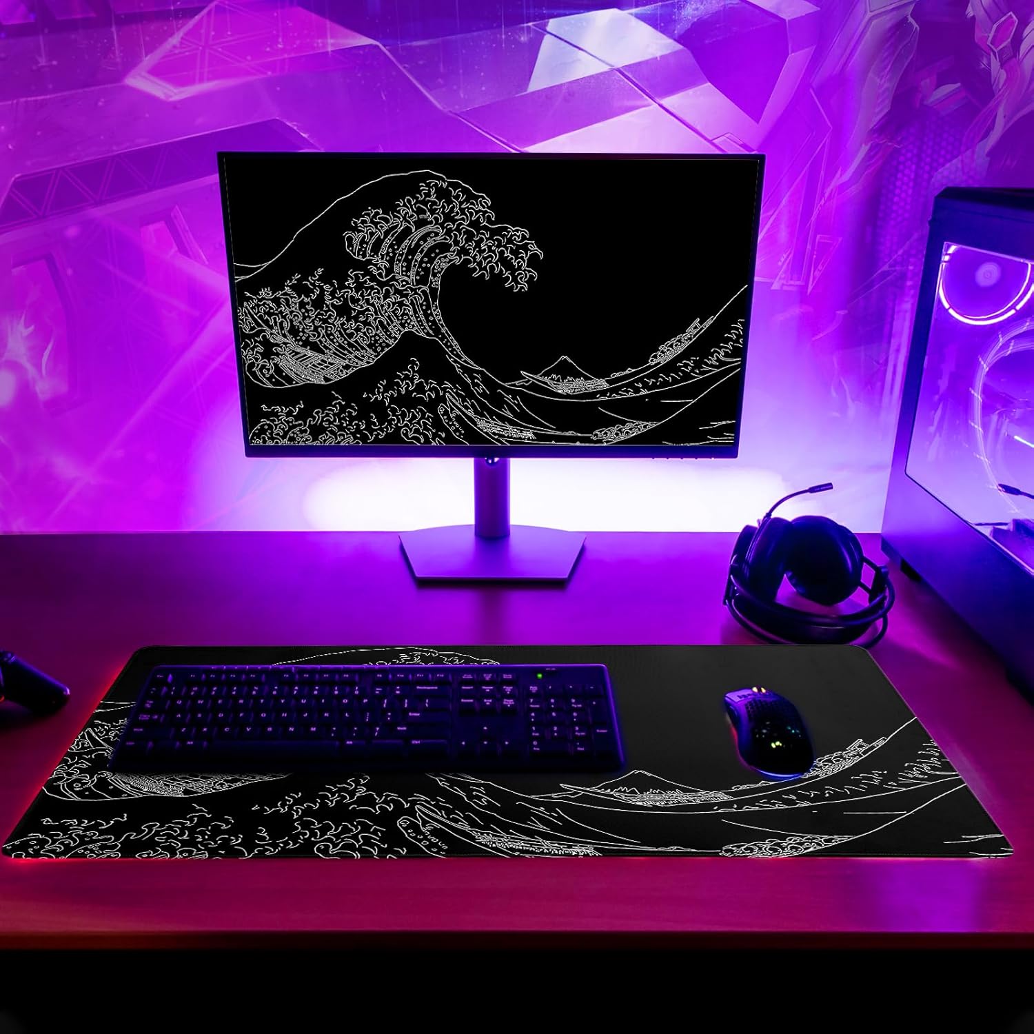 - ♥[Extended Mouse Pad Size]:The extended Japanese Sea Wave desk pad measures 31.5x11.8x0.12 inches that covers most of the desk. Offers a wide area to have your laptop, mouse and keyboard. You can freely move your mouse without any interruption and don't have to continually adjust the mat as you do with traditional mousepads.