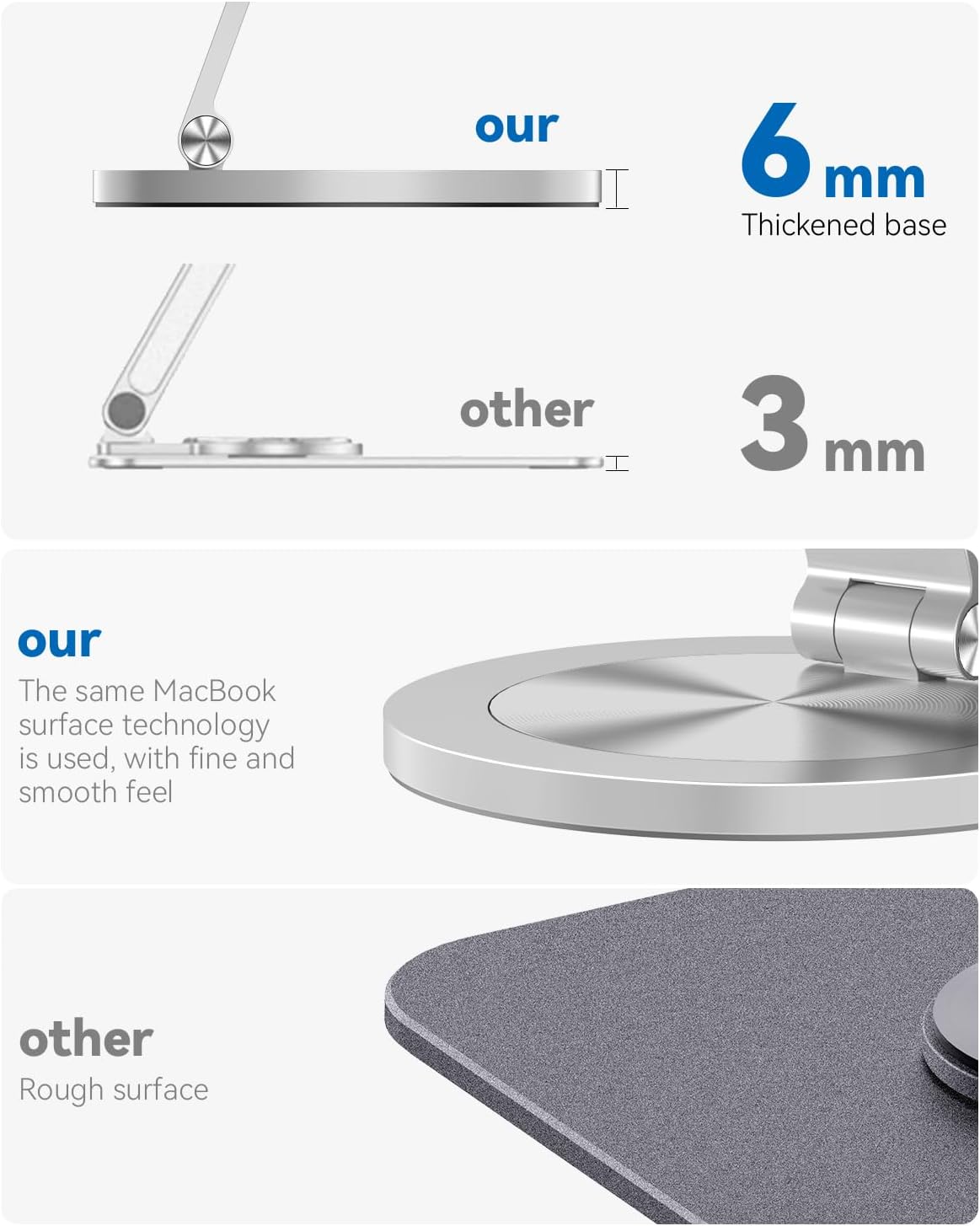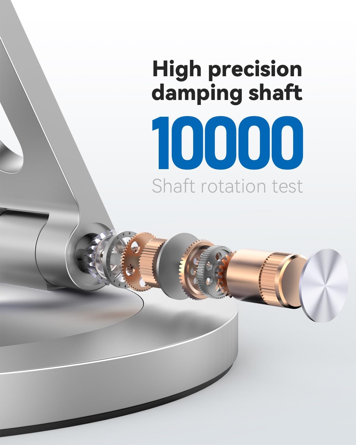 360 Rotating Phone Stand for Desk, Dual-Adjustable Foldable Aluminum Desktop Phone Holder Compatible with iPhone 16 15 14 13 12 11 Series, iPad-Mini, 4-8" All Phones (Silver)