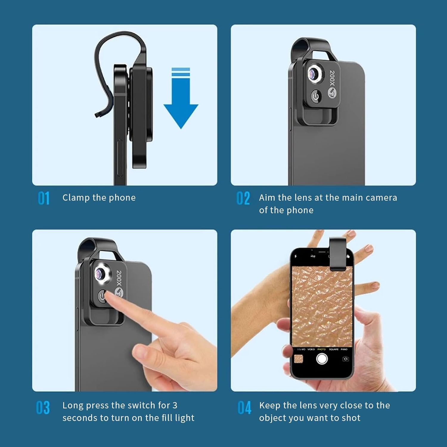 - 200X MAGNIFICATION: Our mini microscope has a universal clip-on design that easily clips onto your cell phone, you will need to zoom in on your phone's camera to get a full screen image. You will need to zoom in on your phone camera to get a full screen image. 200x magnification is required with the phone's zoom function.