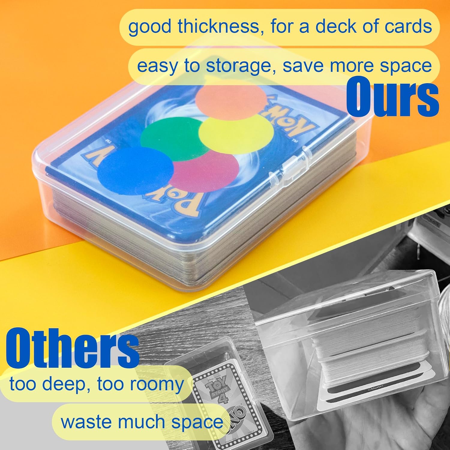 - ➤GOOD QUALITY: Our playing card boxes have thicker plastic compared to other boxes, and with smooth and circular edges. They won't turn yellow or change color after long time use, and the snap closed cover can frequently opens and closes without worrying about damage. The quality is very good.