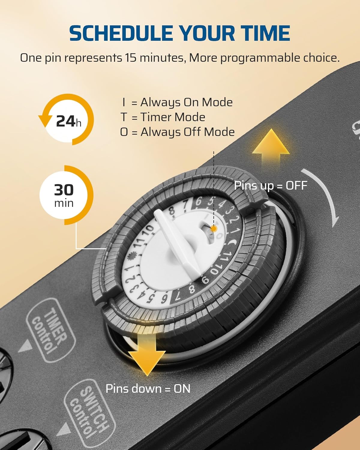 - [Easy to Setup] This power strip timer schedule your devices at a minimum of 30-minute intervals in 24-hour cycle; pins up means off, pins down means on; daily on/off cycle timer function repeats every day at your chosen time