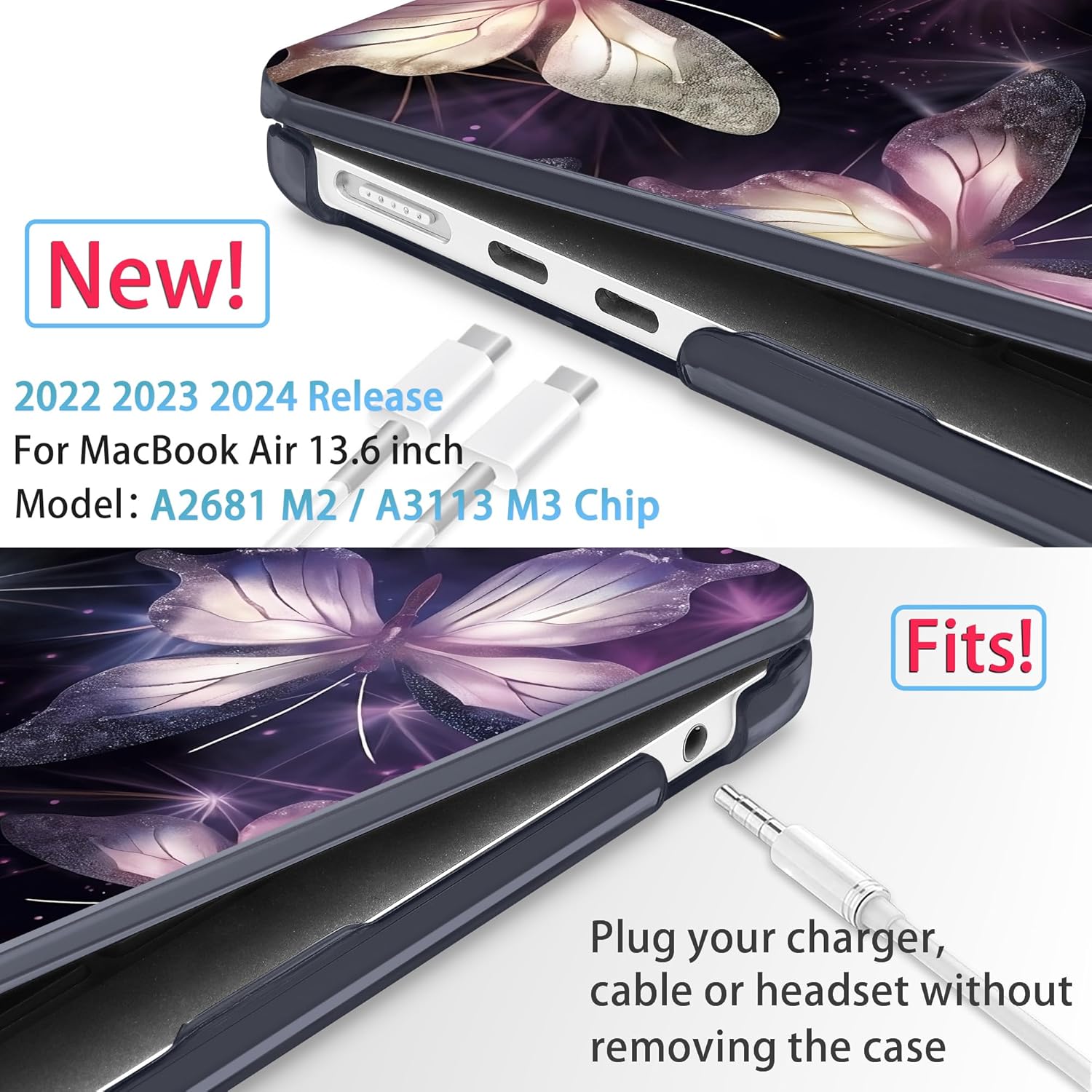 Mektron for 2025 M4 MacBook Air 13.6 Inch A3240 Case Fits 2023 A2681 M2 2024 A3113 M3 Chip with Liquid Retina Display, Printed Plastic Hard Shell Cover for MacBook Air 13.6", Glittering Butterfly