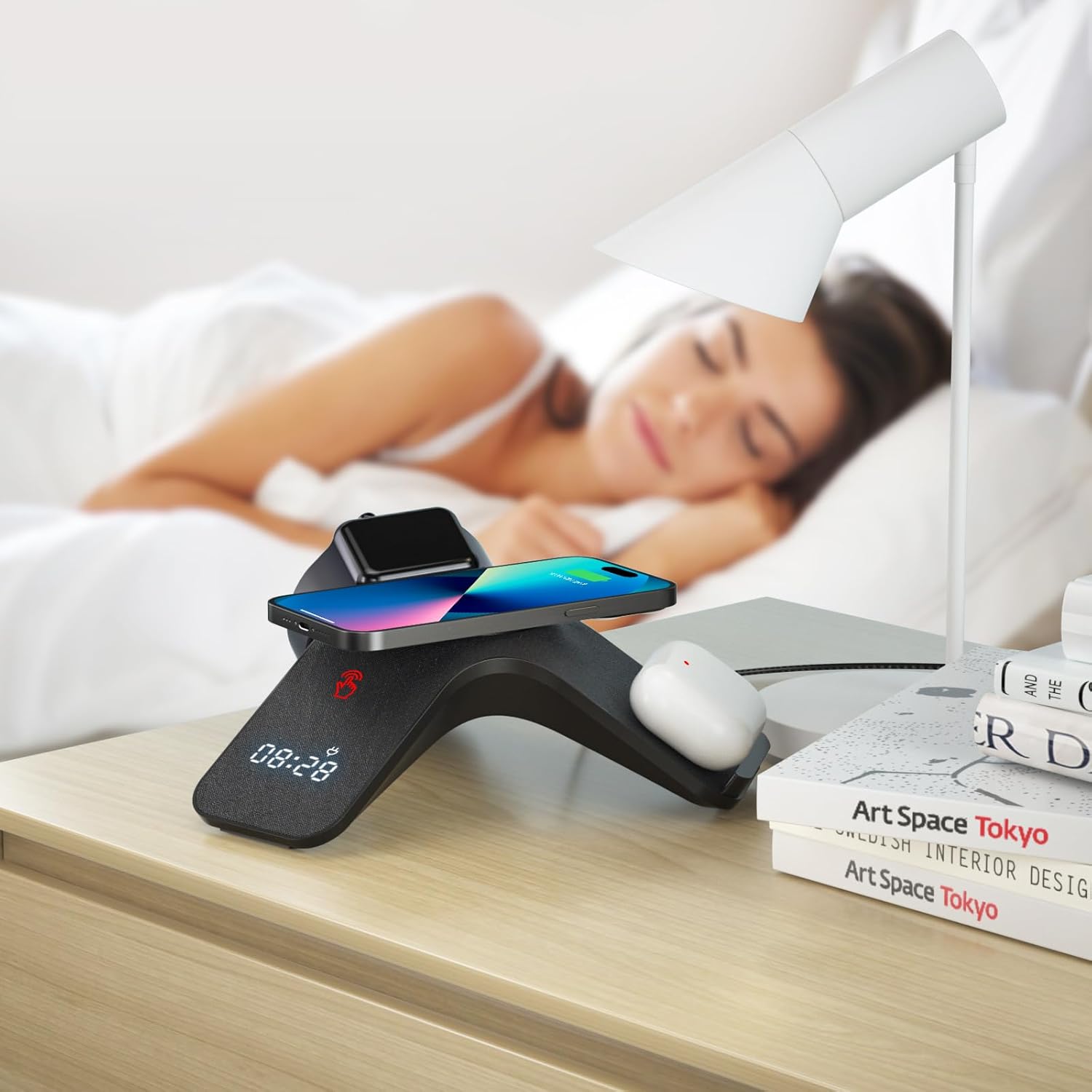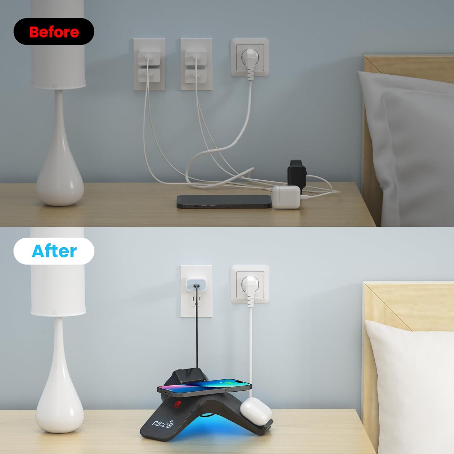 - 【7-Color LED Light & Bluetooth Clock】The wireless charger station has built-in LED lights with 7 colors that can be switched according to your mood or create a soothing atmosphere. After connecting your phone to the wireless charger via Bluetooth, you can calibrate the time. [Note] This product does not have an alarm clock function.