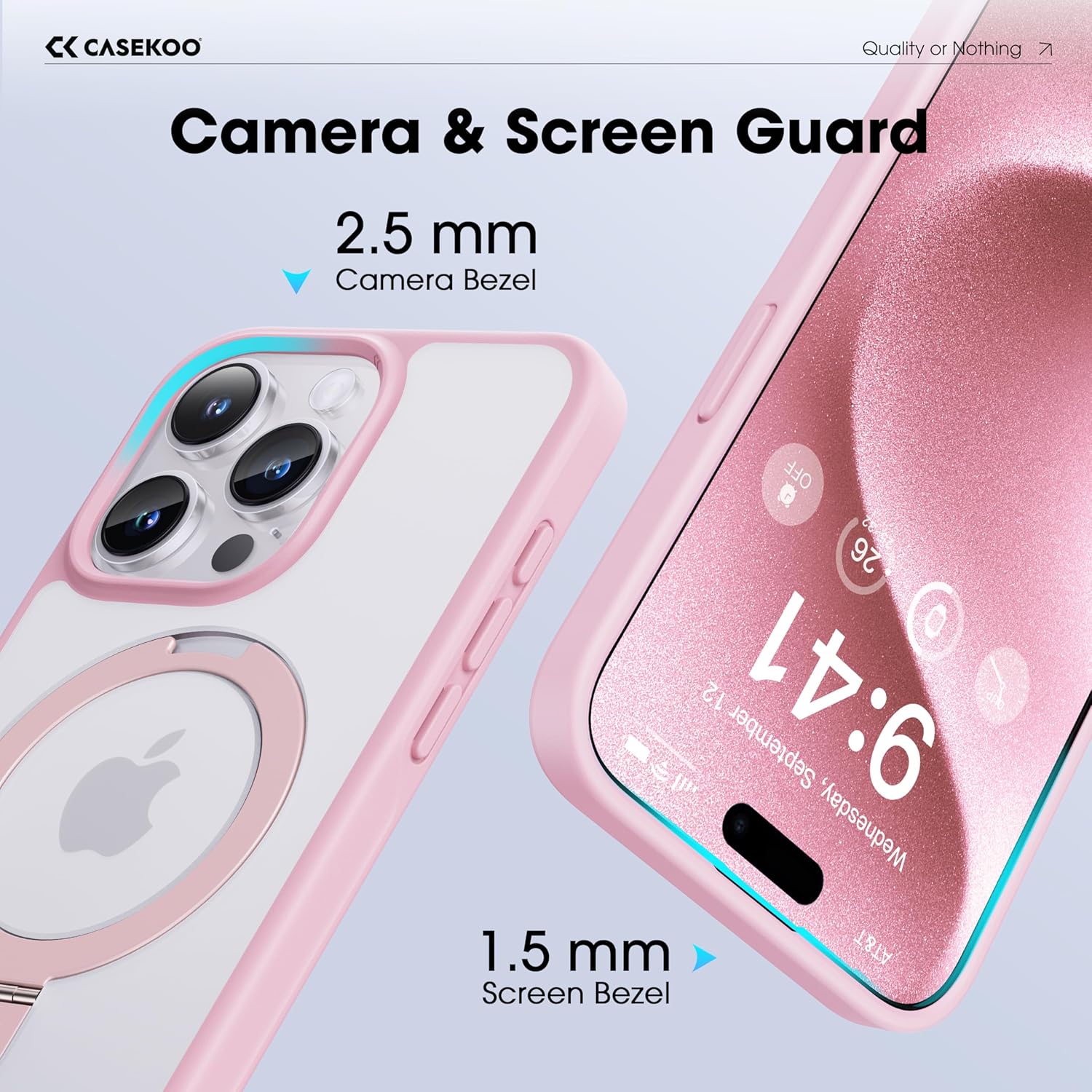 CASEKOO Designed for iPhone 15 Pro Case with Magnetic Invisible Stand [Military Drop Protection] [Compatible with MagSafe] Shockproof Slim Translucent Matte Pro Case 6.1 Inch, Pink