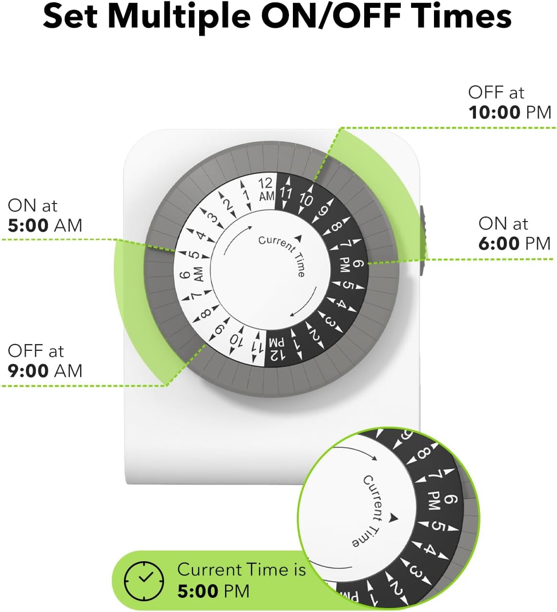 - 【Save Money Automatically】 Reduce energy costs by automating your appliances with our dual-outlet timer. Ideal for controlling fans, lamps, coffee machines, Christmas Lightings, grow lights and more, it helps you save money, even when you’re away from home.