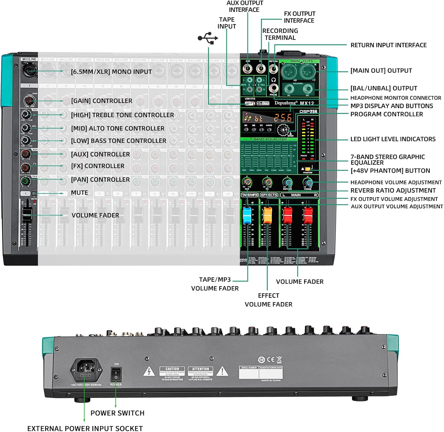 - 12 channel mixer, with MUTE , MP3 function with USB and DSP digital effects, rotary compressor for easy control, stronger bass and cleaner vocals.