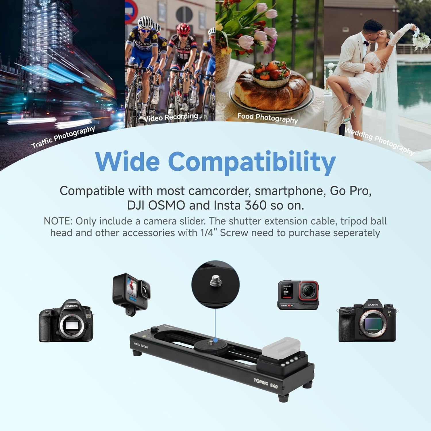 - Flexible Shooting Modes & Strong Compatibility:The Toprig S60 Motorized Camera Slider is built to handle diverse creative needs, offering flexible setups for horizontal, vertical, and slanted shooting to adapt to various scenes. It supports a load capacity of 4kg horizontally and 2.5kg vertically (at 90° tilt), making it compatible with DSLRs, GoPros, smartphones, and more