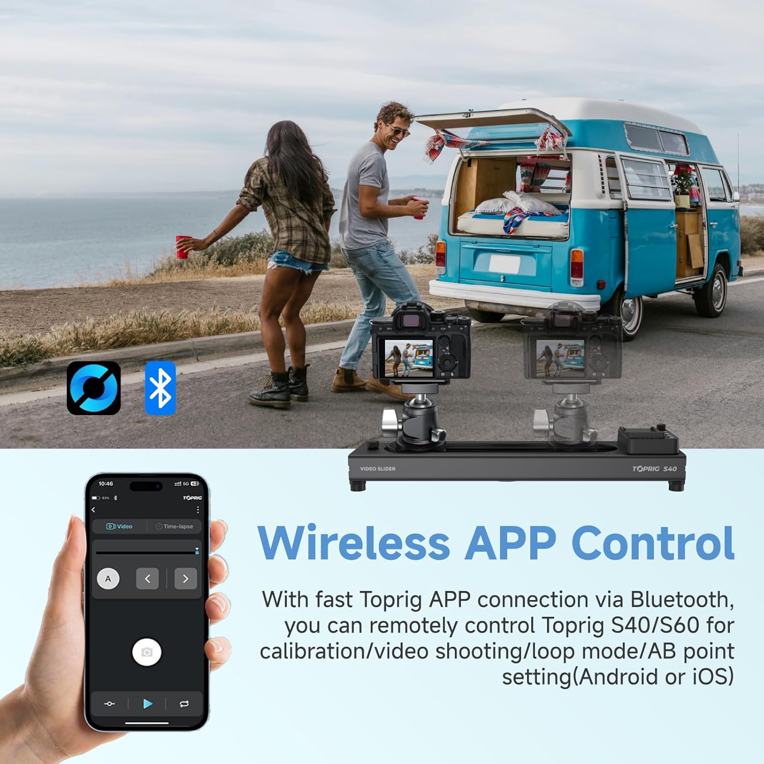 - Ultra Silent Stepper Motor: Designed with ultra brushless stepper motor, which makes toprig S40 dolly track slider smoother and more stable. Less than 30dB decibel rating, it is very suitable for video production, no need to worry about buzzing background noise