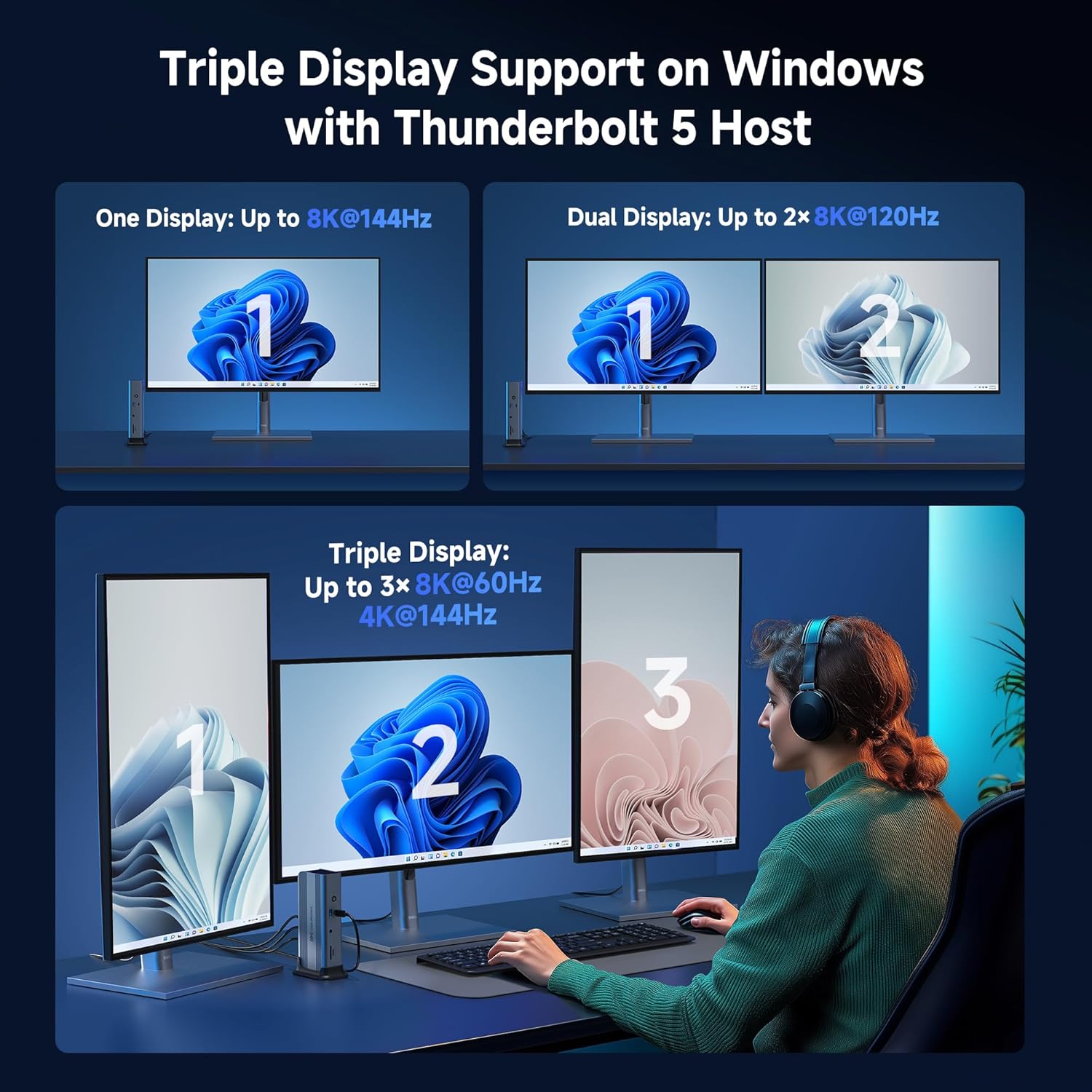 - Optimized for Professionals and Creators: Experience seamless compatibility tailored for advanced workflows. MacBook users benefit from dual 6K@60Hz support on M1/M2/M3/M4 Pro/Max & M4 Base chipsets, single 8K@60Hz on all M4 silicon, and single 6K@60Hz on M1/M2/M3 Base models. Windows Thunderbolt 5 laptops unlock the power of triple 8K@60Hz/4K@144Hz or dual 8K@120Hz or single 8K@144Hz display, while Thunderbolt 4 laptops support single 8K@60Hz or dual 4K@120Hz setups. Perfect for high-demand visual applications, whether you're editing, designing, or multitasking.