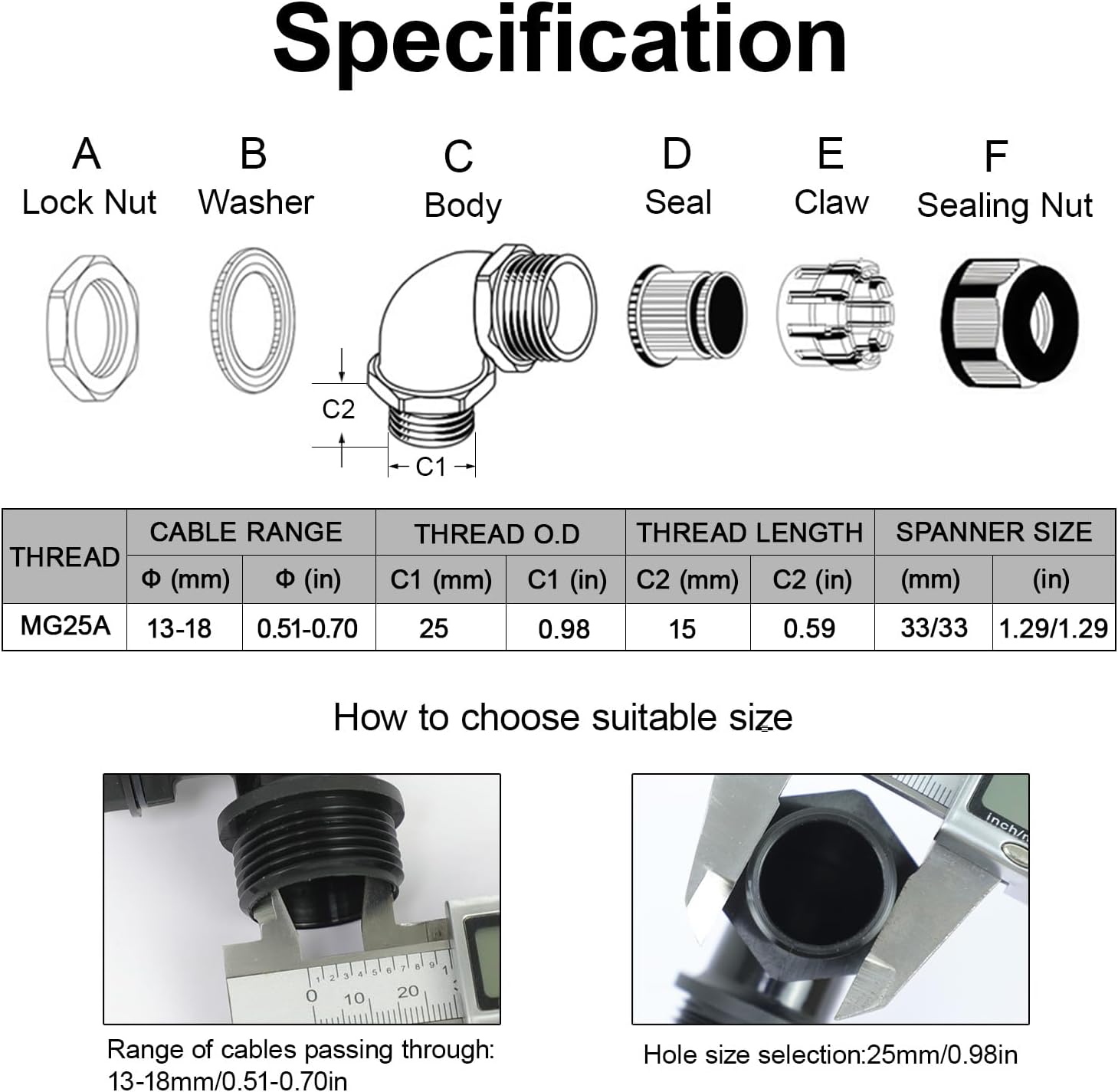- Cable Range: M25 cable connectors has cable range 0.51in-0.70in (13-18mm) and specific data for cable and hole-drilling please refer picture of specification.